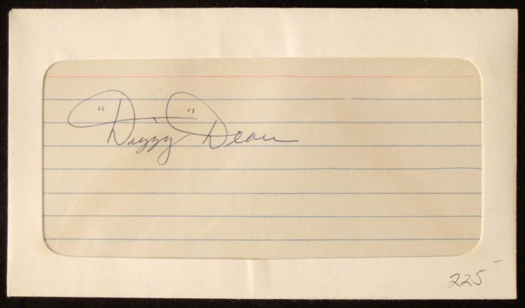 Offered here is an autographed 3x5" index card by Jay Hanna "Dizzy Dean". It's in a envelope, he signed it "Dizzy" Dean in black pen, and is near mint condition. * Dean was best known for leading the 1934 "Gashouse Gang" St. Louis team. He had a 30-7 record with a 2.66 ERA during the regular seasonThe Gashouse Gang was the southernmost and westernmost team in the major leagues at the time, and became a de-facto "America's Team." Team members, particularly Southerners such as the Dean brothers and Pepper Martin, became folk heroes in Depression-ravaged America. Americans saw in these players, dirty and hustling rather than handsome and graceful, a spirit of hard work and perseverance, as opposed to the haughty, highly-paid New York Giants, whom the Cardinals chased for the National League pennant. *