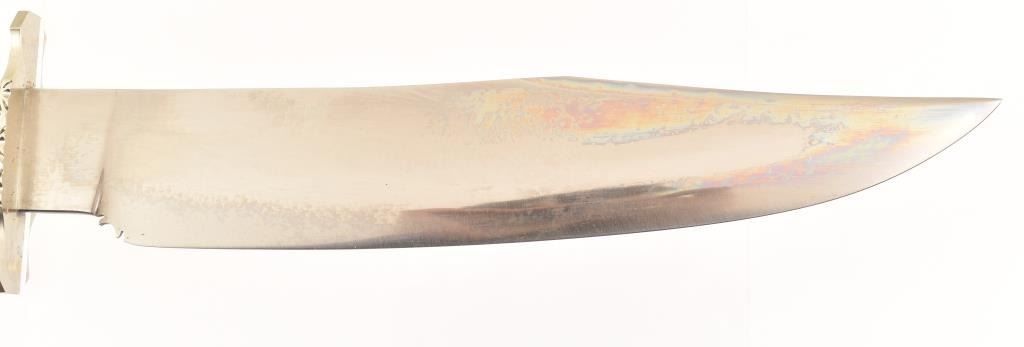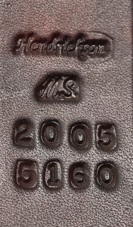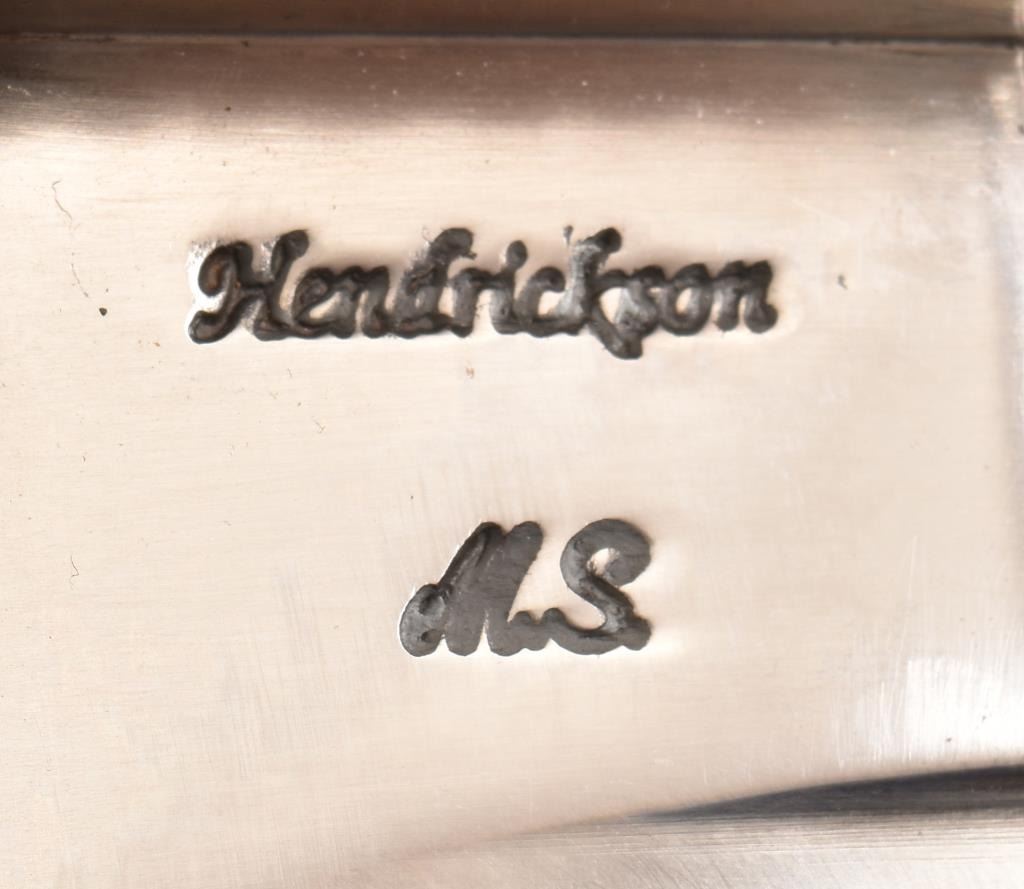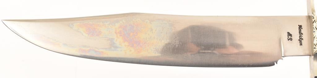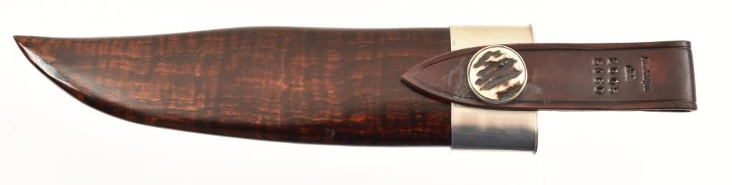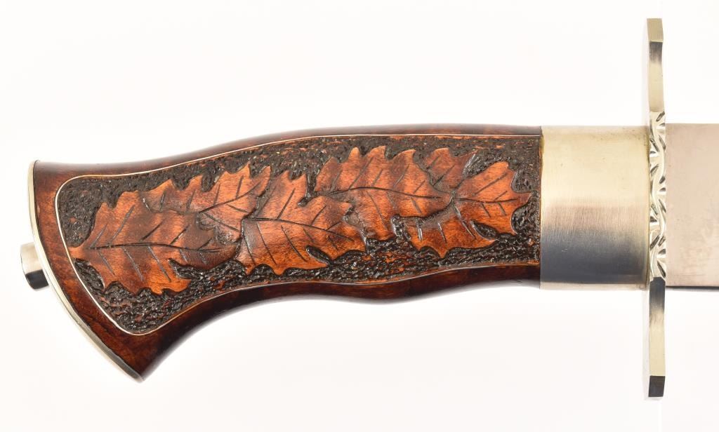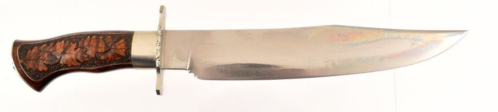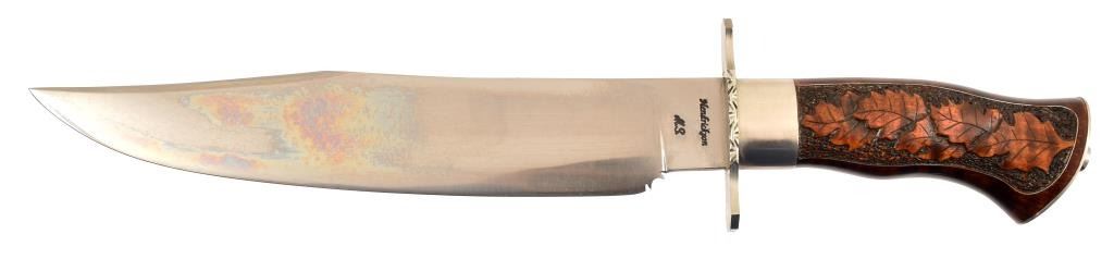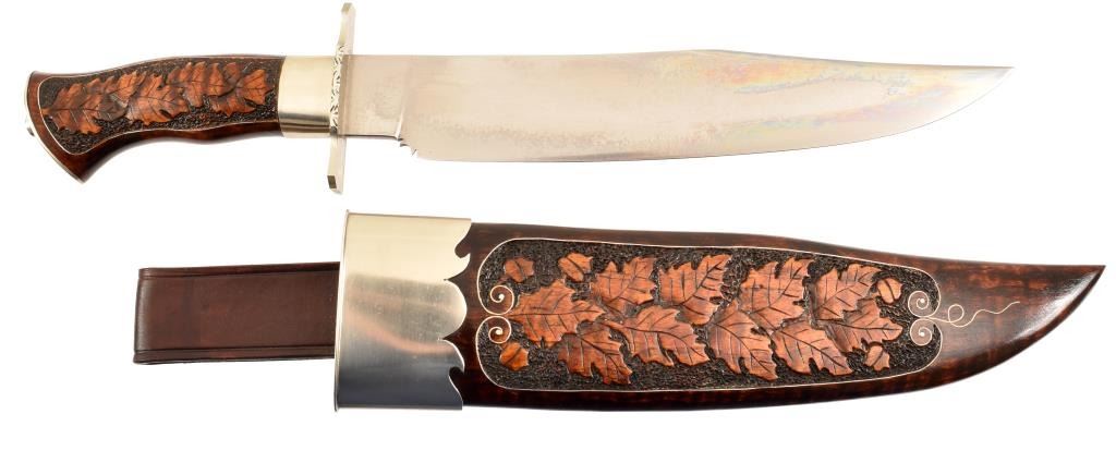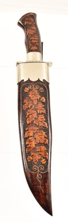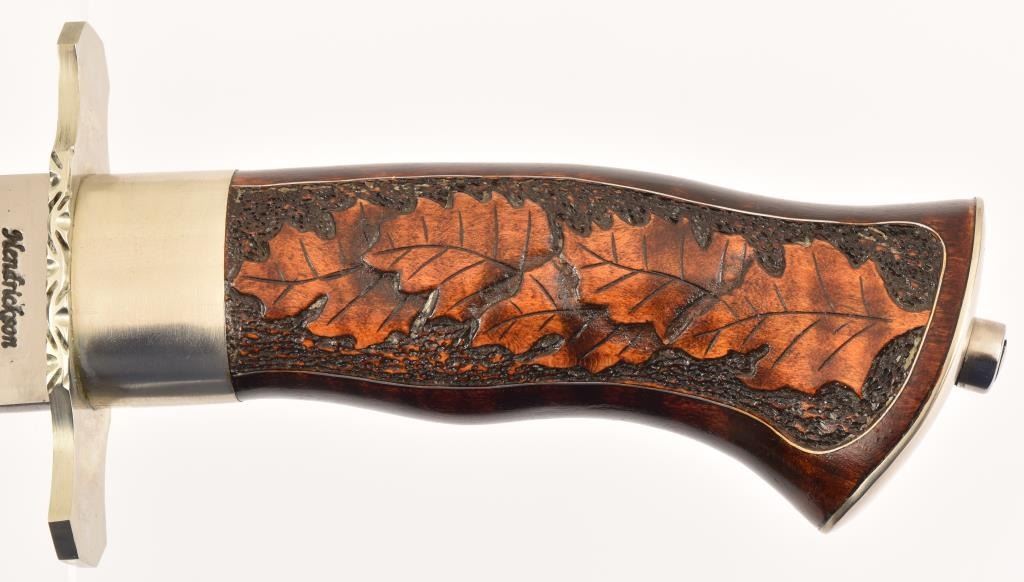Curly maple handle with carved oak leaves. 11" blade marked "Hendrickson M.S." Custom curly maple sheath dated 2005, carved oak leaves wrapped in silver wire inlay. Overall knife length is 16"