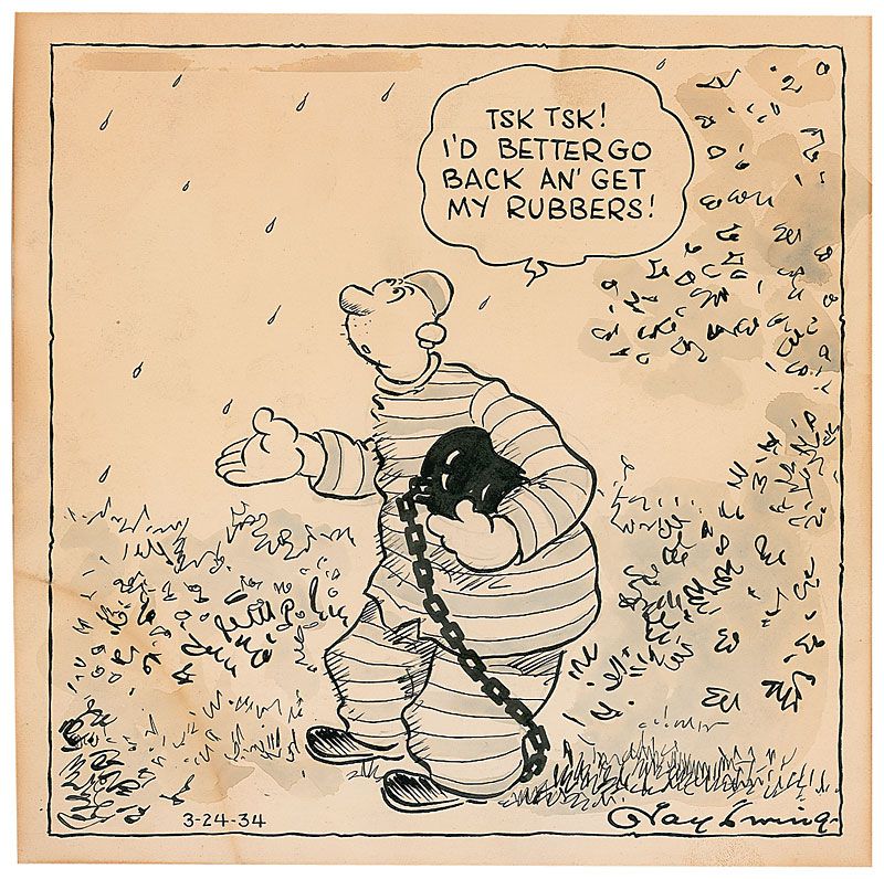 Original signed ink sketch of an escaping convict, dated March 24, 1934, on an off-white 8.75 x 8.75 card. In very good condition, with light toning to edges, mounting remnants to upper left, and some damp staining to lower right.