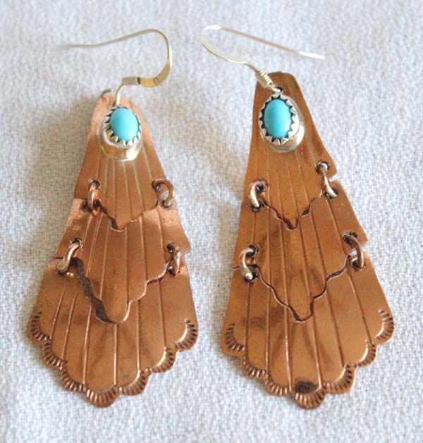 Jay King Copper & Turquoise Earrings. Three linked stamped copper pieces with turquoise cabochon. Sterling fish hook ear wires, measuring 3.25'' long, 7/8'' wide.