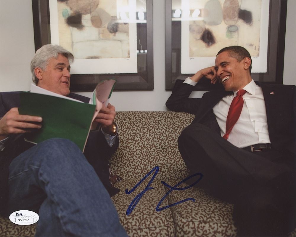 Photo measures 8" x 10" in size and is hand-signed in blue felt tip pen by Jay Leno. The autograph includes an official James Spence Authentication (JSA) hologram and matching COA for authenticity purposes.