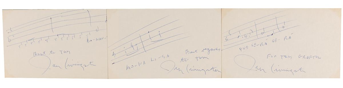 Three AMQSs with multiple bars of music penned by Jay Livingston on individual 5 x 3 off-white cards. Musical selections are “Que Sera, Sera,” “Mona Lisa,” and “Bonanza,” all inscribed. In fine condition, with shadows from previous display at the corners of each card.