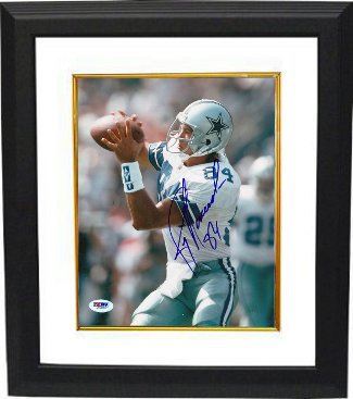 Jay Novacek was a key contributor for Dallas in the early 1990s, assisting them to three Super Bowl wins in four seasons. In those games, he recorded a combined total of 17 receptions for 148 yards and two touchdowns. In his 11 seasons, Novacek recorded 422 receptions for 4,630 yards and 30 touchdowns. Jay Novacek has hand signed this Dallas Cowboys 8x10 Photo. PSA Hologram and Certificate of Authenticity. Custom White Mat and Premium Black Frame as shown