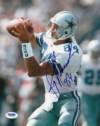 Jay Novacek was a key contributor for Dallas in the early 1990s, assisting them to three Super Bowl wins in four seasons. In those games, he recorded a combined total of 17 receptions for 148 yards and two touchdowns. In his 11 seasons, Novacek recorded 422 receptions for 4,630 yards and 30 touchdowns. Jay Novacek has hand signed this Dallas Cowboys 8x10 Photo. PSA Hologram and Certificate of Authenticity.