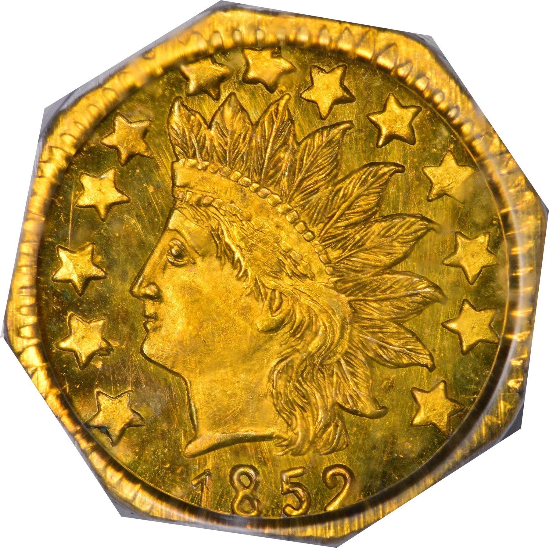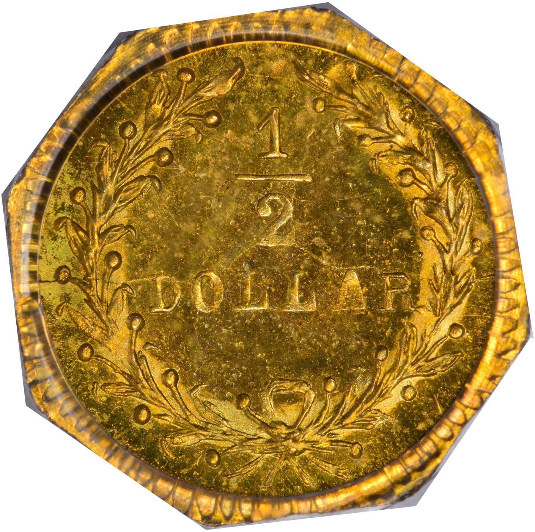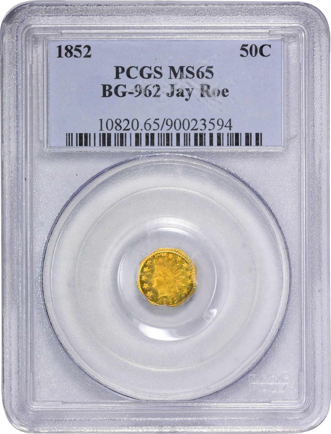 Description: "1852" (1881-83) octagonal ½ Dollar, BG-962 Jay Roe. PCGS MS65. Low Rarity 7. Flashy, mirrorlike Gem Brilliant Uncirculated, light toning spots both sides. PCGS MS65 Jay Roe (PCGS# 10820). PCGS POP 3 + 1.