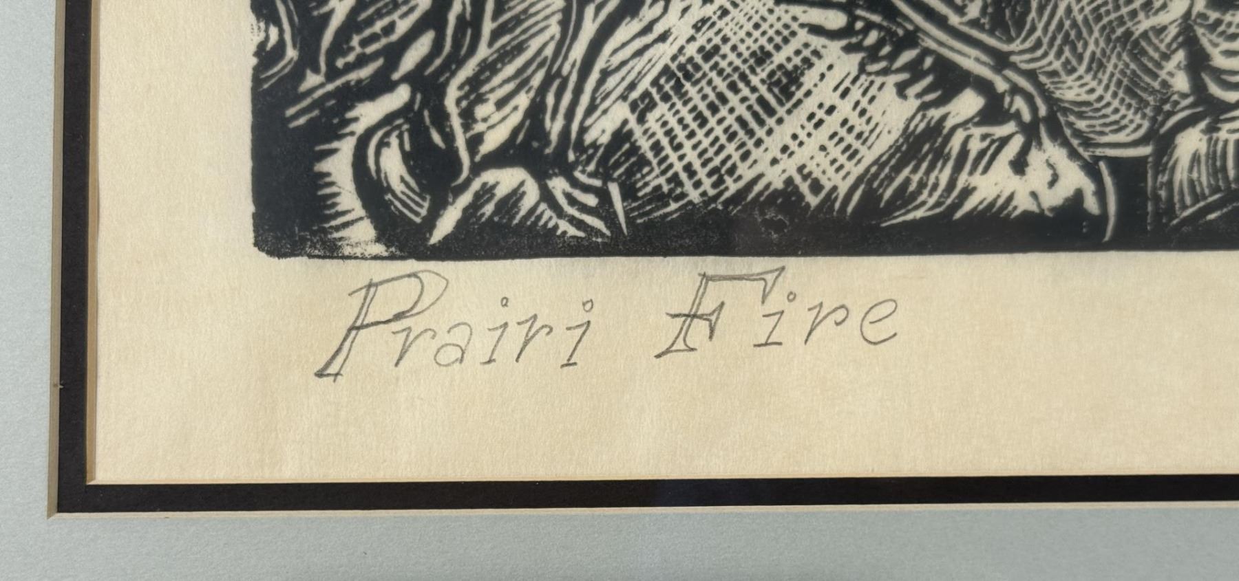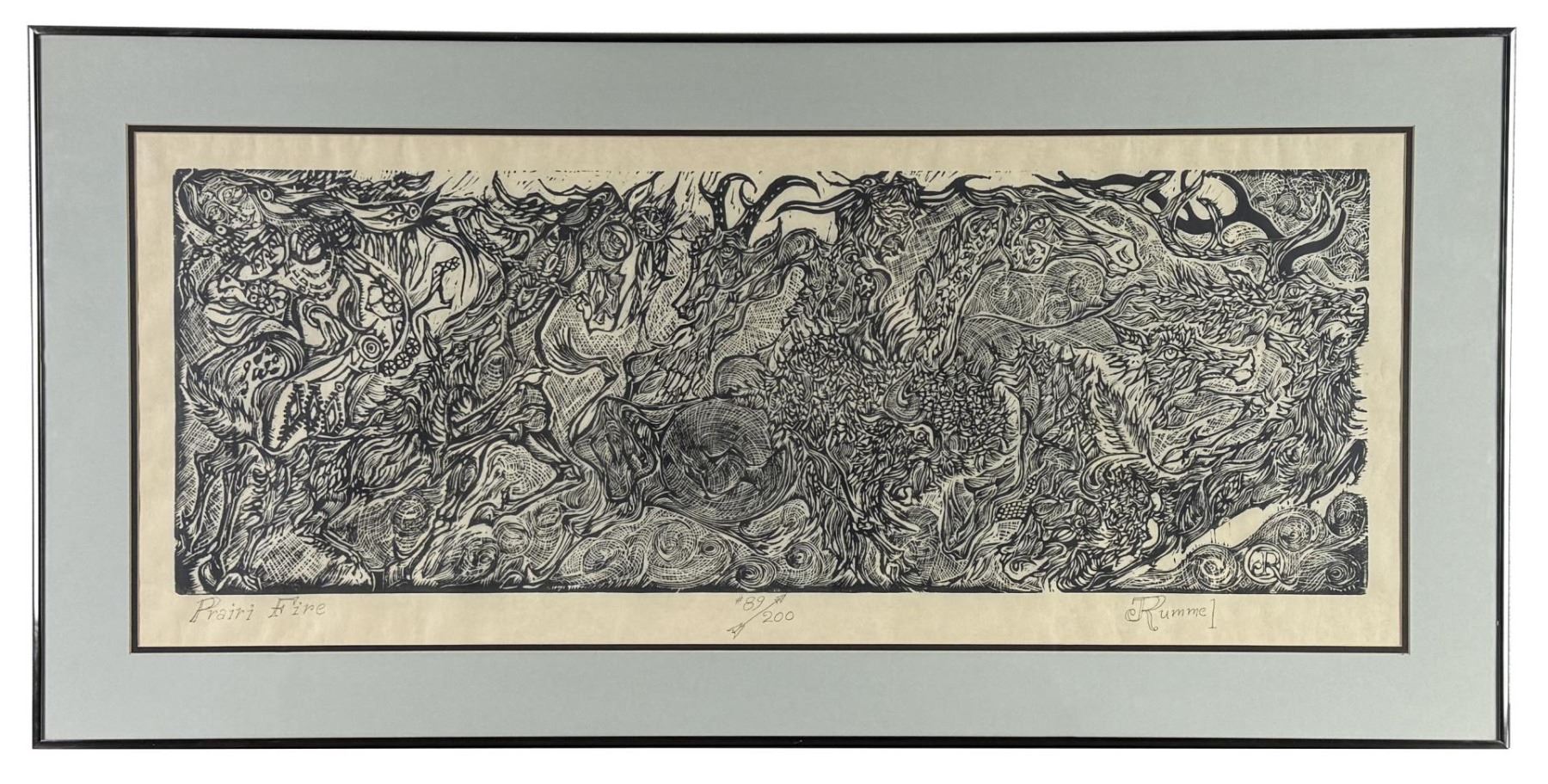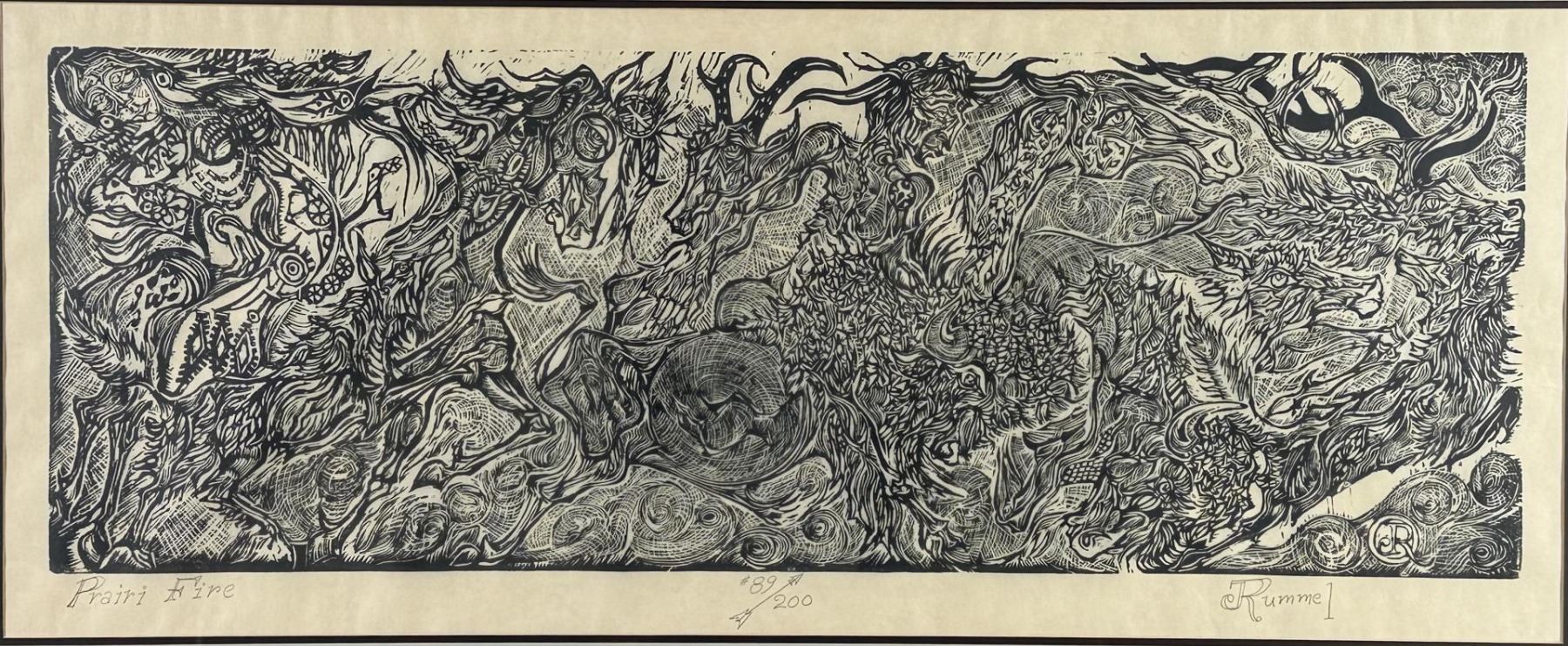 Title is Prairi Fire. 89/200. 19" by 40" unframed. 21 1/2" by 44" framed. Woodblock on Paper. A Missoula artist, Rummel was known for his love of Native American and pioneer storytelling, the paintings of Charlie Russell, 1960's psychedelia, folk music and modern art. The Five Valleys Trilogy is one of his most significant works. Three panels are titled, from left to right: Road to the Buffalo, When First Unto this Country, and Lady from Missoula County. MAM's prints are from an edition of photolithographs derived from the original large-scale paintings that Rummel created between 1981-1983 with assistance from Doug Grimm. The paintings were commissioned originally for the Top Hat Bar and are on long-term loan to the University of Montana. The Road to the Buffalo is translated from the Nez Perce name for the Blackfoot River corridor, Cokahlah-ishkit. Local tribes used the foot trail to cross the Continental Divide into the Rocky Mountain Front. Lewis & Clark used the trail in 1806, followed by the Big Blackfoot Railroad, which in the early 1900s transported lumber to the Anaconda mill in Bonner. More recently, conservation efforts have helped the Road to the Buffalo recover from industrial pollution to host excellent fishing and biking trails. When First Unto this Country depicts the landscape and Native American culture that flourished for 10,000 years before Europeans arrived. Lady from Missoula County is the contemporary local art and music scene that Rummel knew well. The print features Missoula most well-known downtown watering holes, local musicians like the Snake River Outlaws, and a crew of Eddie's Club regulars -- including Rummel and Lee Nye, the bartender-photographer who so famously documented the bar's patrons.