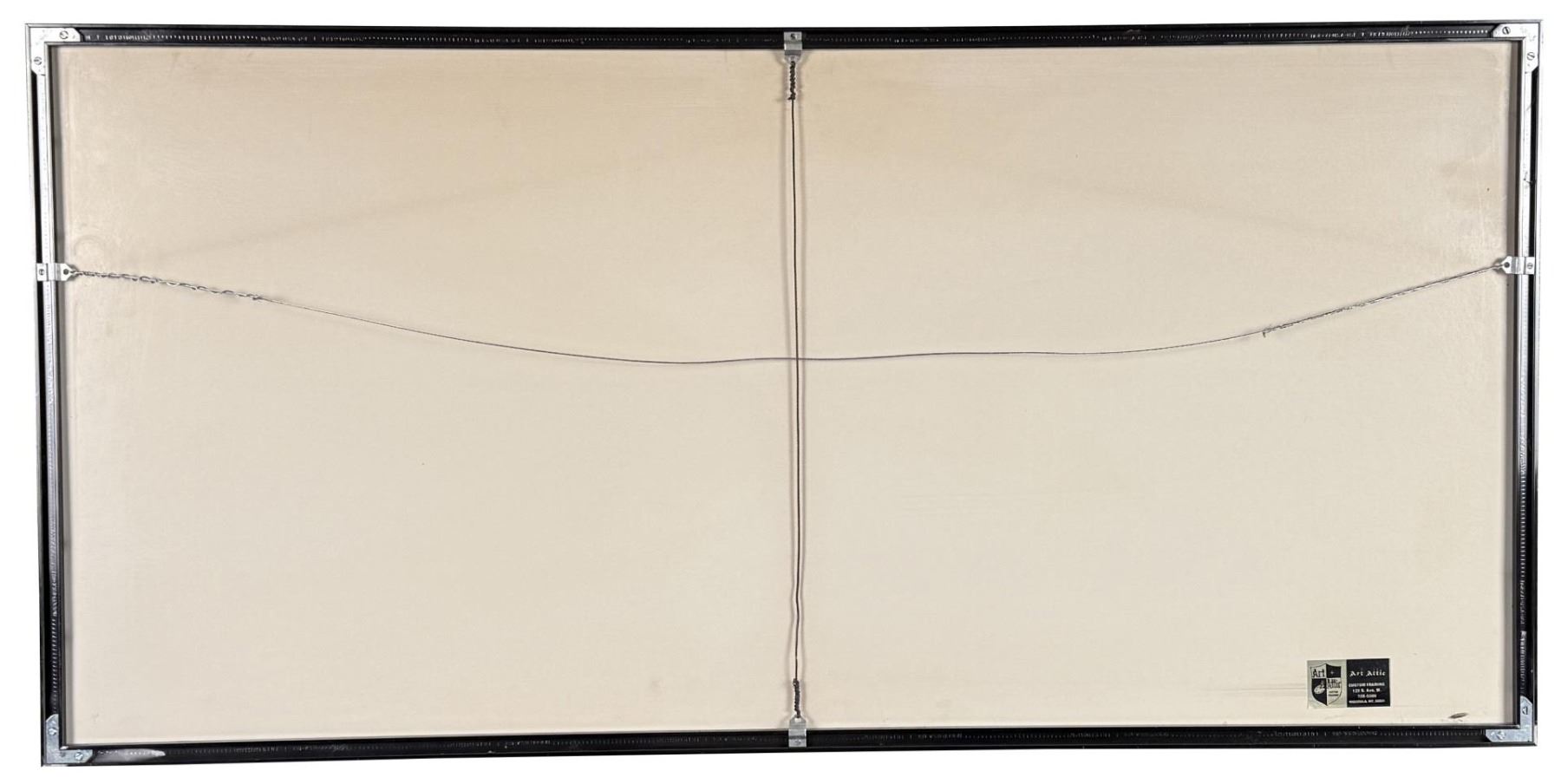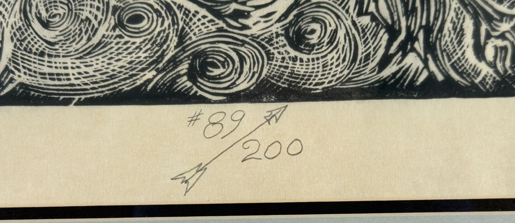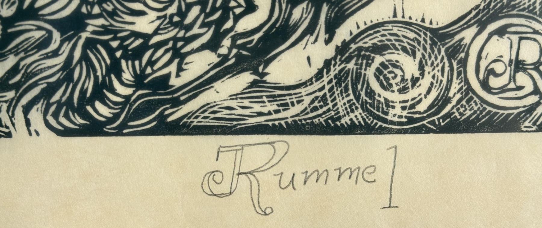 Title is Prairi Fire. 89/200. 19" by 40" unframed. 21 1/2" by 44" framed. Woodblock on Paper. A Missoula artist, Rummel was known for his love of Native American and pioneer storytelling, the paintings of Charlie Russell, 1960's psychedelia, folk music and modern art. The Five Valleys Trilogy is one of his most significant works. Three panels are titled, from left to right: Road to the Buffalo, When First Unto this Country, and Lady from Missoula County. MAM's prints are from an edition of photolithographs derived from the original large-scale paintings that Rummel created between 1981-1983 with assistance from Doug Grimm. The paintings were commissioned originally for the Top Hat Bar and are on long-term loan to the University of Montana. The Road to the Buffalo is translated from the Nez Perce name for the Blackfoot River corridor, Cokahlah-ishkit. Local tribes used the foot trail to cross the Continental Divide into the Rocky Mountain Front. Lewis & Clark used the trail in 1806, followed by the Big Blackfoot Railroad, which in the early 1900s transported lumber to the Anaconda mill in Bonner. More recently, conservation efforts have helped the Road to the Buffalo recover from industrial pollution to host excellent fishing and biking trails. When First Unto this Country depicts the landscape and Native American culture that flourished for 10,000 years before Europeans arrived. Lady from Missoula County is the contemporary local art and music scene that Rummel knew well. The print features Missoula most well-known downtown watering holes, local musicians like the Snake River Outlaws, and a crew of Eddie's Club regulars -- including Rummel and Lee Nye, the bartender-photographer who so famously documented the bar's patrons.