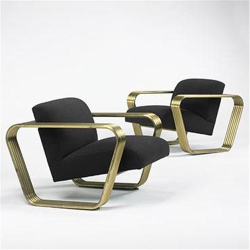 Jay Spectre<BR>lounge chairs, pair<BR>USA, c. 1975<BR>brass, upholstery<BR>34 w x 41 d x 30 h inches<BR><BR>Condition of the item is not included in this description. Condition reports are available from Wright upon request. Wright strongly recommends that you review a condition report for each item on which you plan to bid.