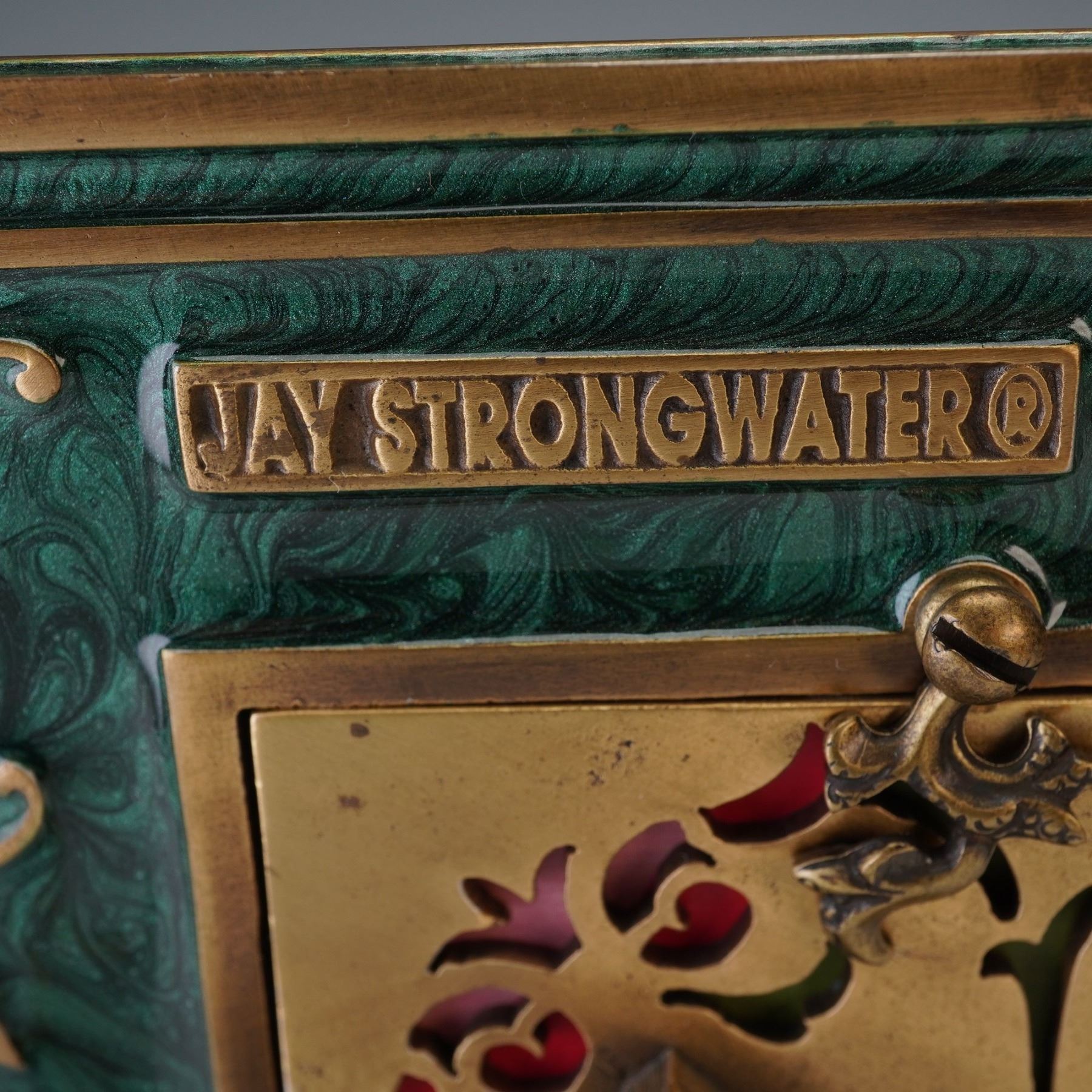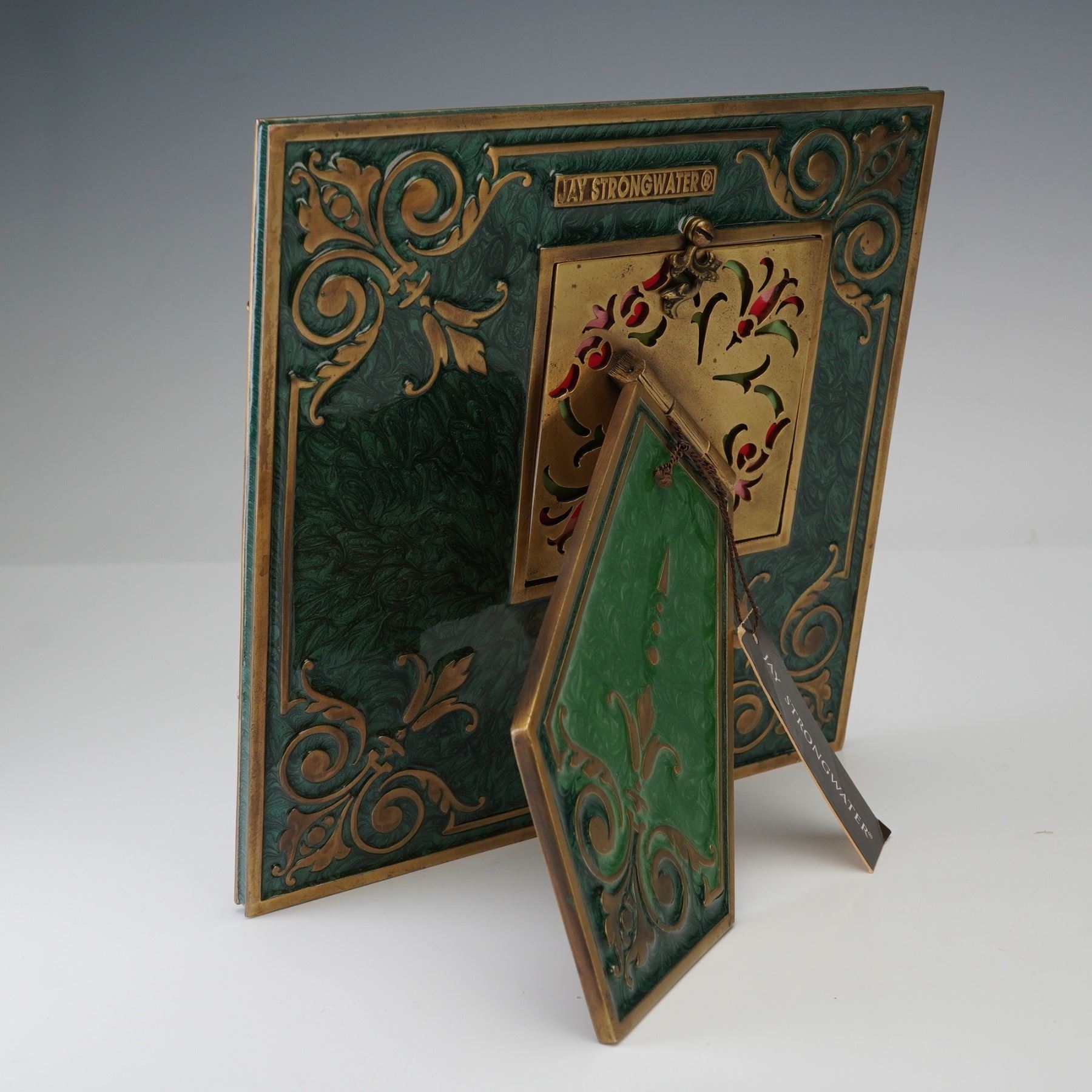 An exquisite picture frame crafted from cast bronze with hand-enameled detailing. The front features sculpted dogwood blossoms in shades of cream and blush with green enamel leaves and jeweled centers, set against a marbled butter-yellow ground. The reverse is finished in deep emerald enamel with gilt scrolling accents, bearing the Jay Strongwater mark and original label. Both decorative and functional, the frame showcases the designer's signature fusion of old-world craftsmanship and opulent artistry. A striking example of Strongwater's celebrated decorative work, ideal for adding a touch of luxury to any setting.