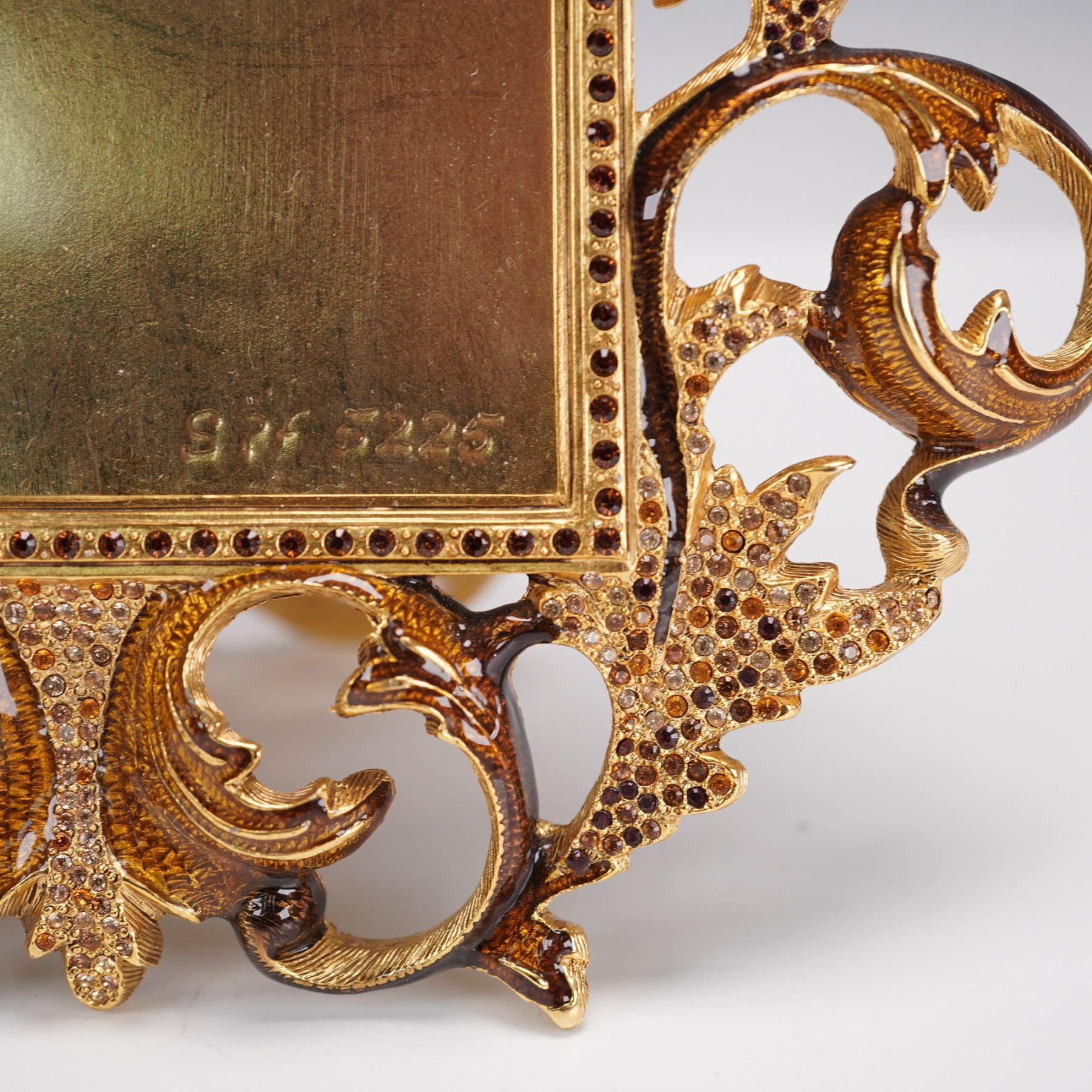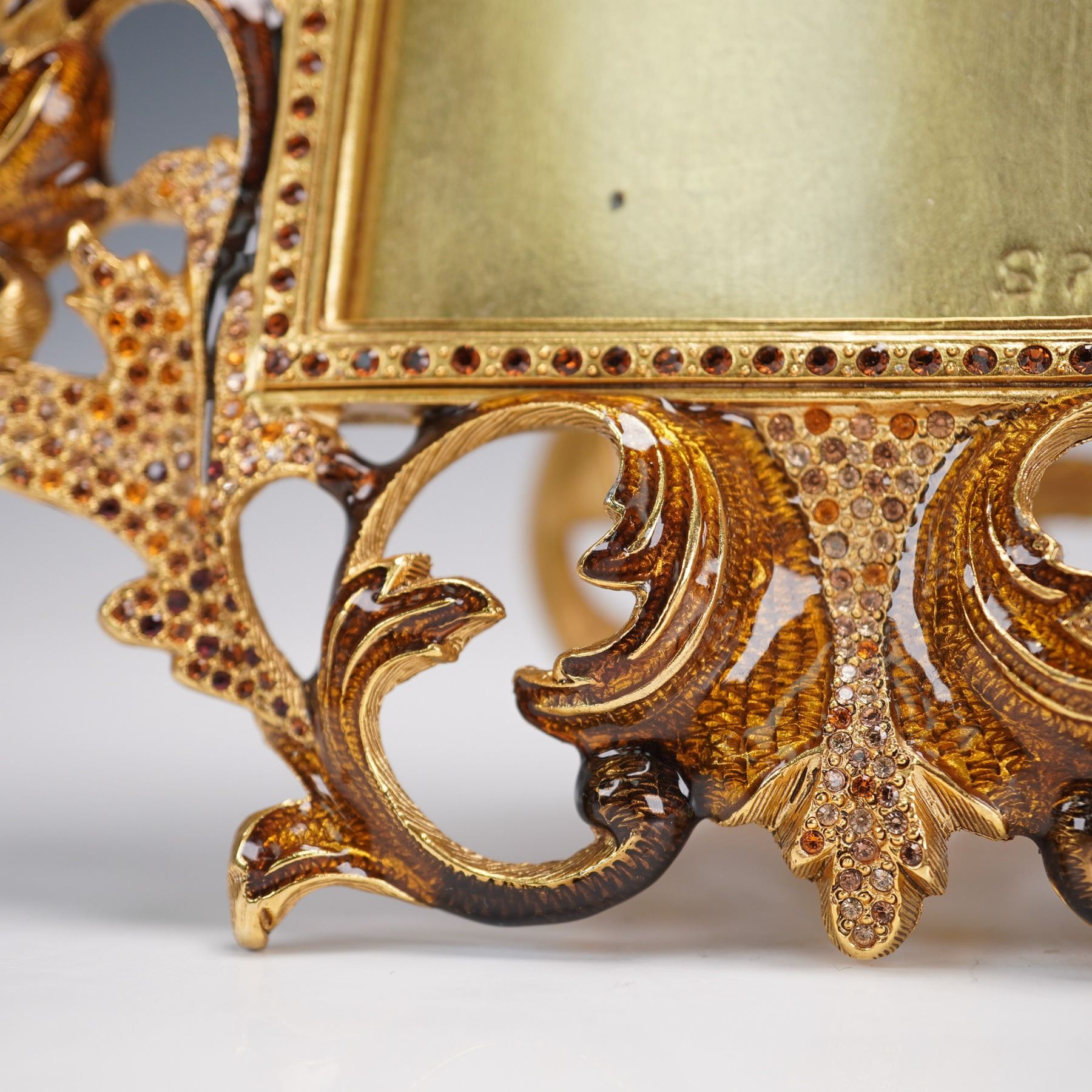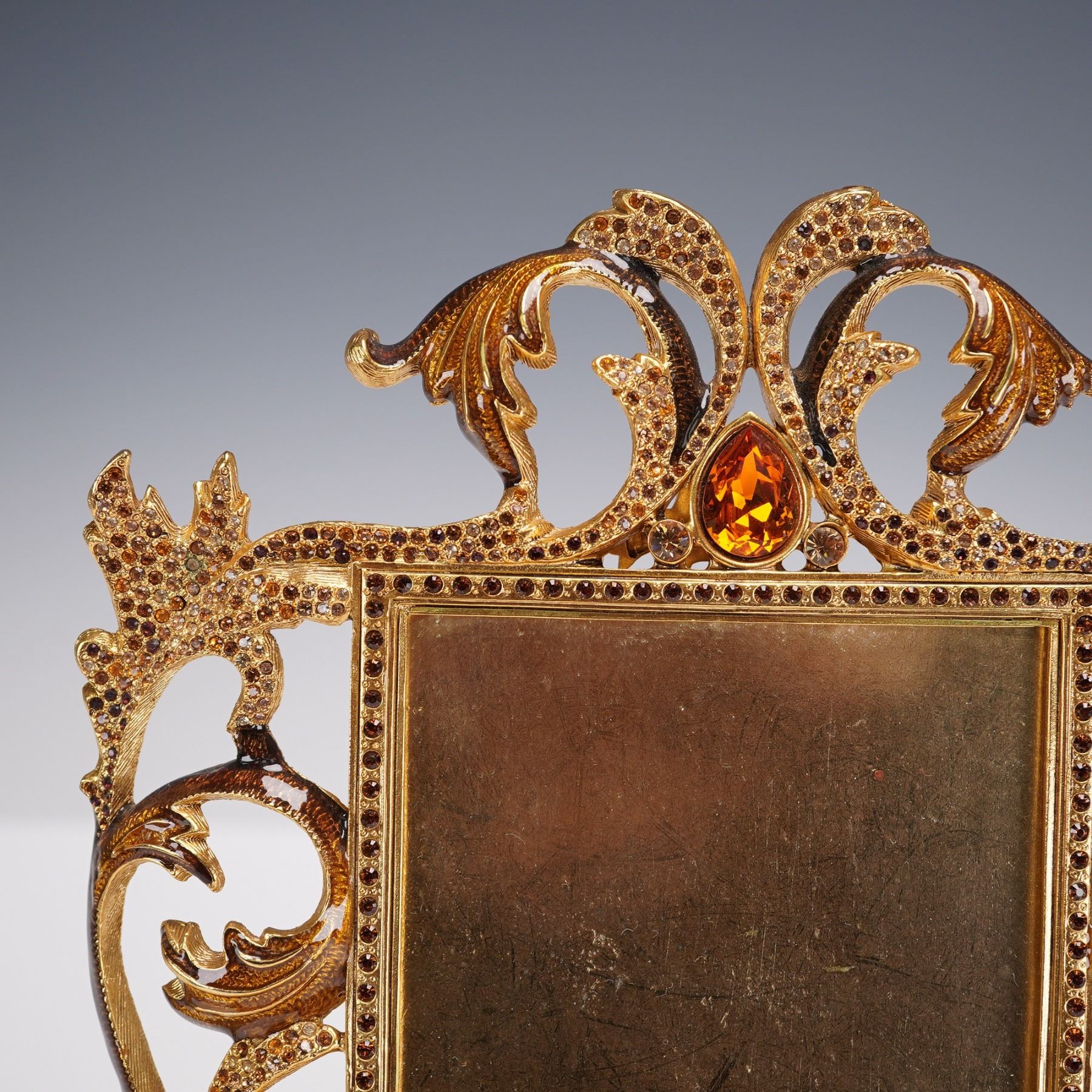 Picture frame with an ornate gold tone border of scrolling leaves, set with amber and honey colored stones and topped with a large faceted gem, bold and decorative with a warm glowing finish. Marked Jay Strongwater.