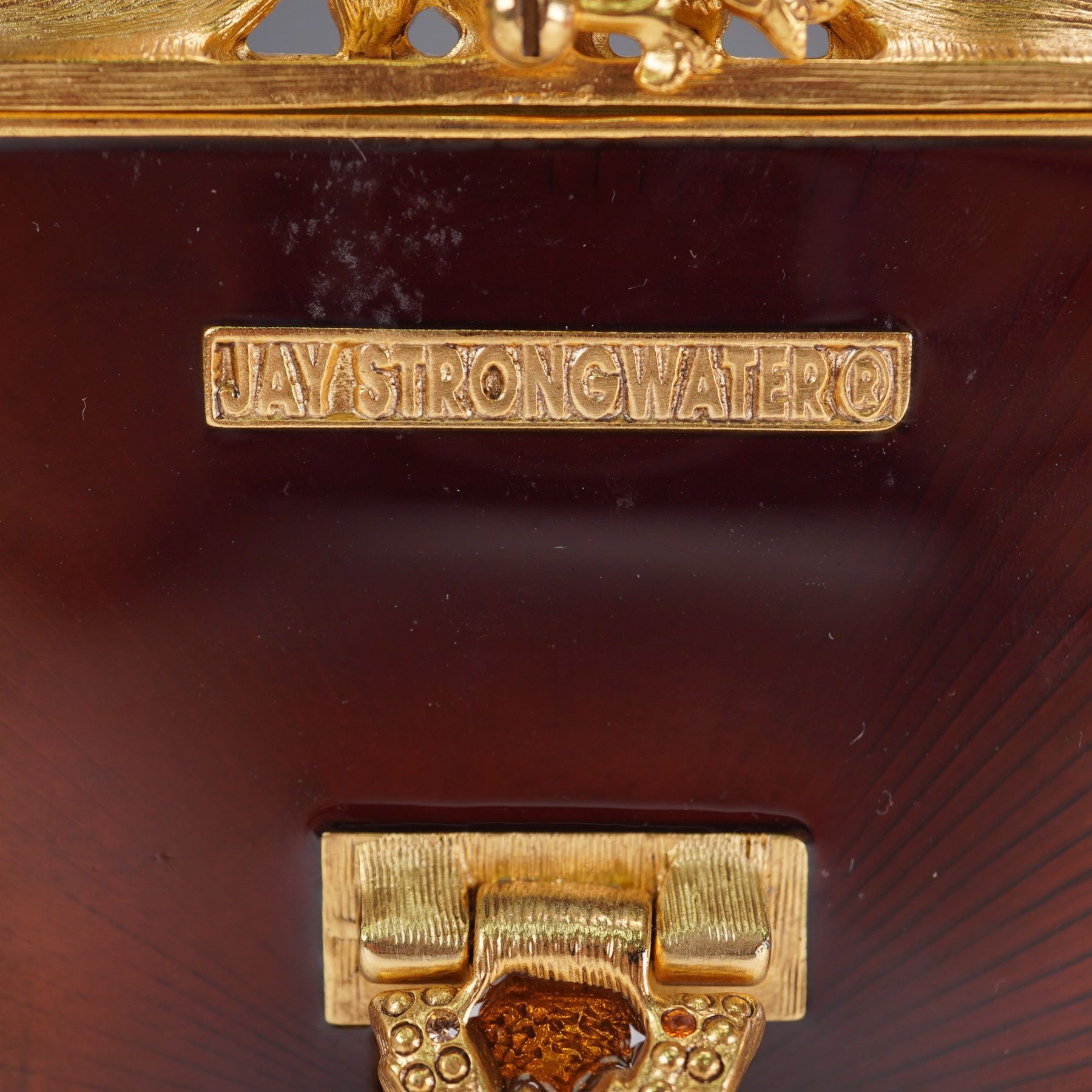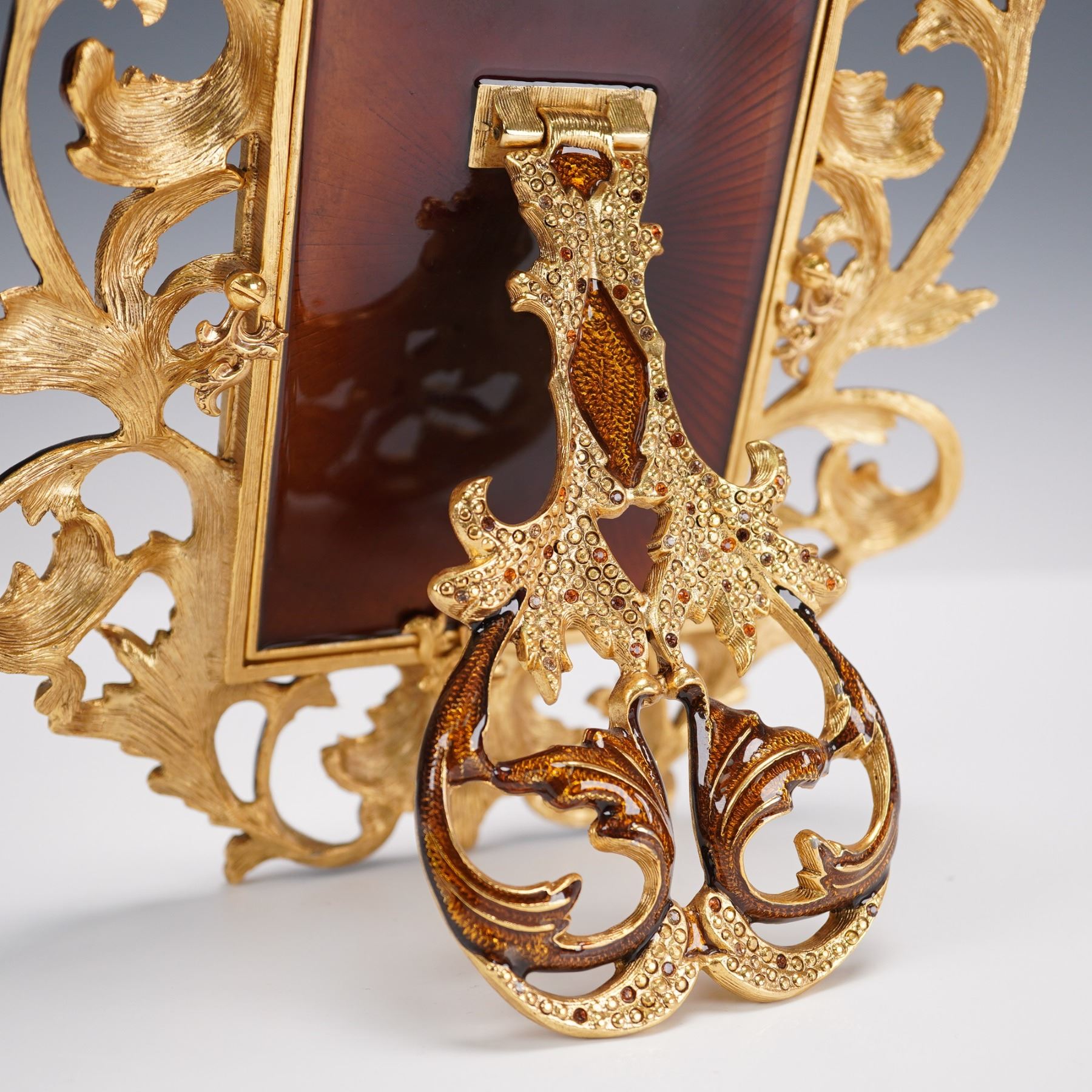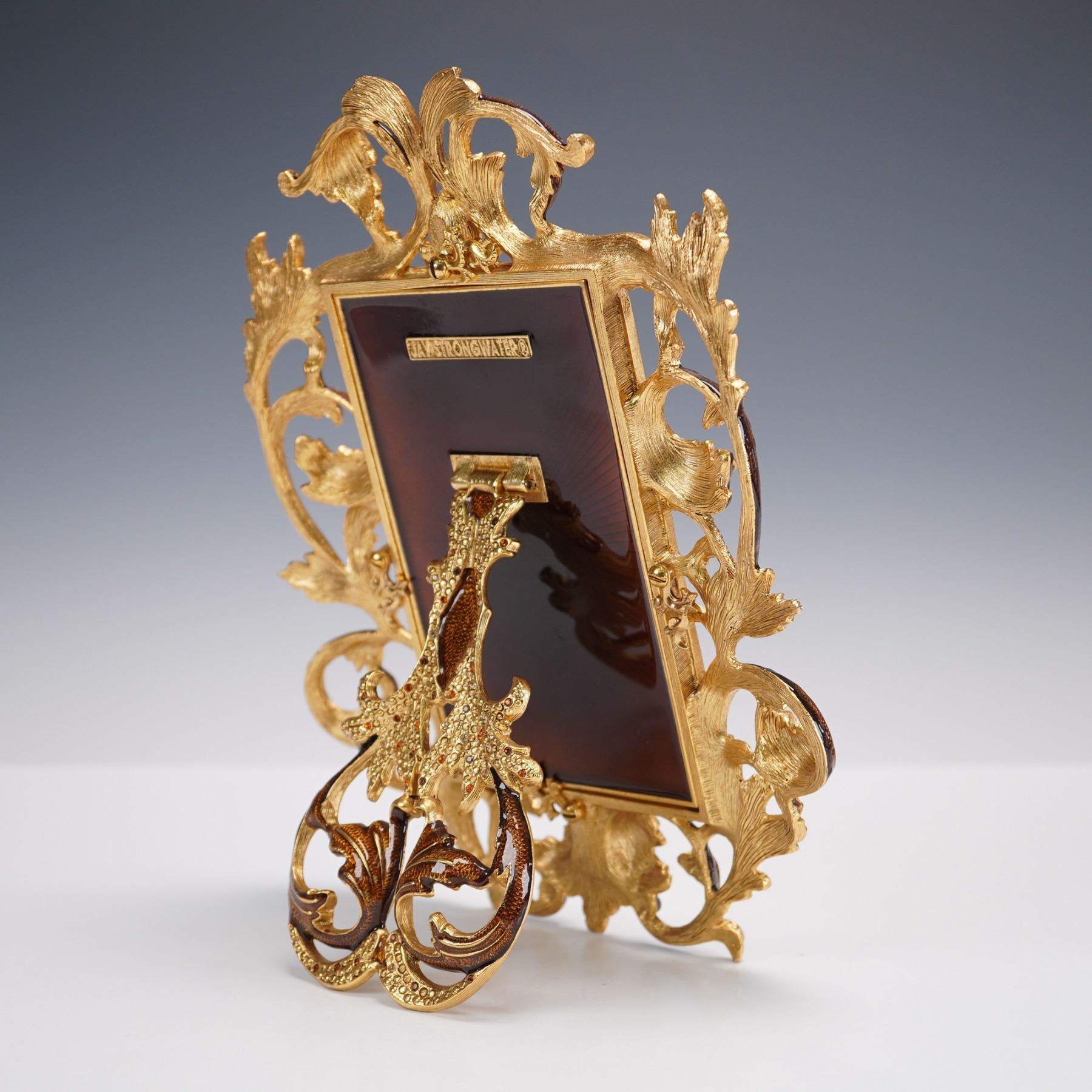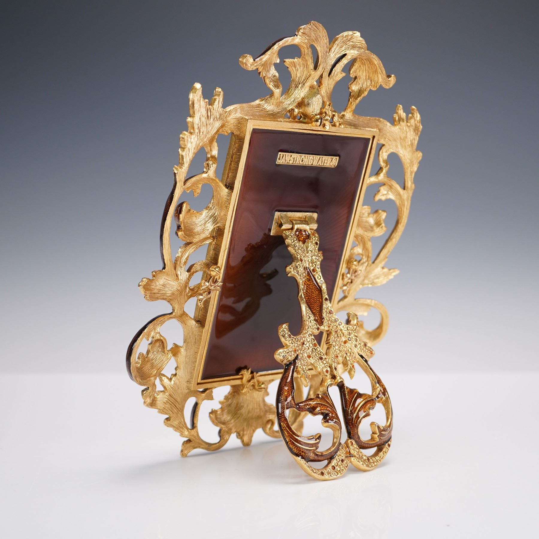 Picture frame with an ornate gold tone border of scrolling leaves, set with amber and honey colored stones and topped with a large faceted gem, bold and decorative with a warm glowing finish. Marked Jay Strongwater.