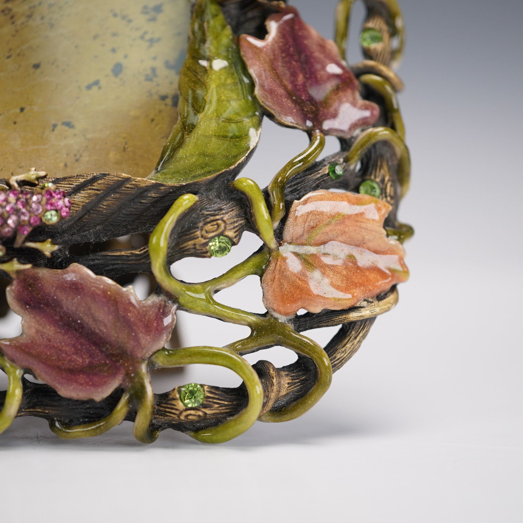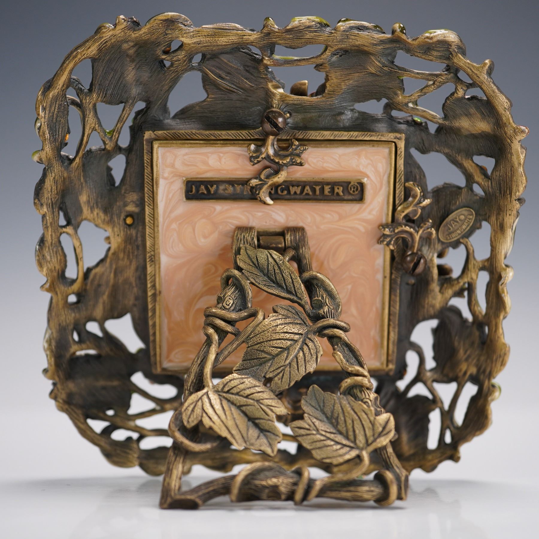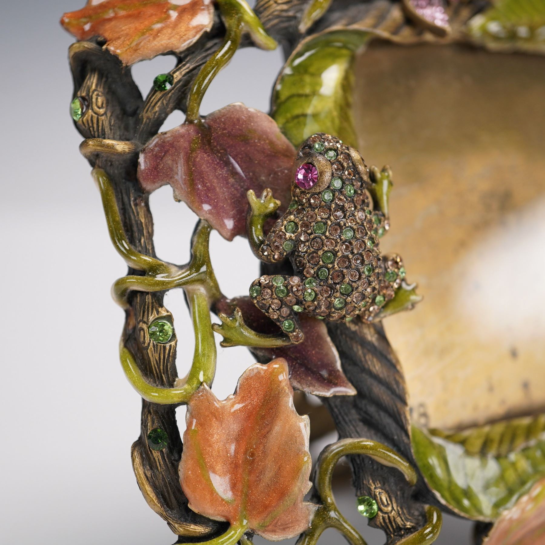 Jay Strongwater enamel and jeweled picture frame styled as an garden scene, featuring hand painted vines and autumnal leaves, winding through a sculptural openwork border adorned with sparkling crystal studded frogs, delicate butterflies, and whimsical flies, signed Jay Strongwater, a richly detailed and imaginative design, full of woodland charm and storybook elegance, excellent condition. Marked Jay Strongwater. Marked 5138.