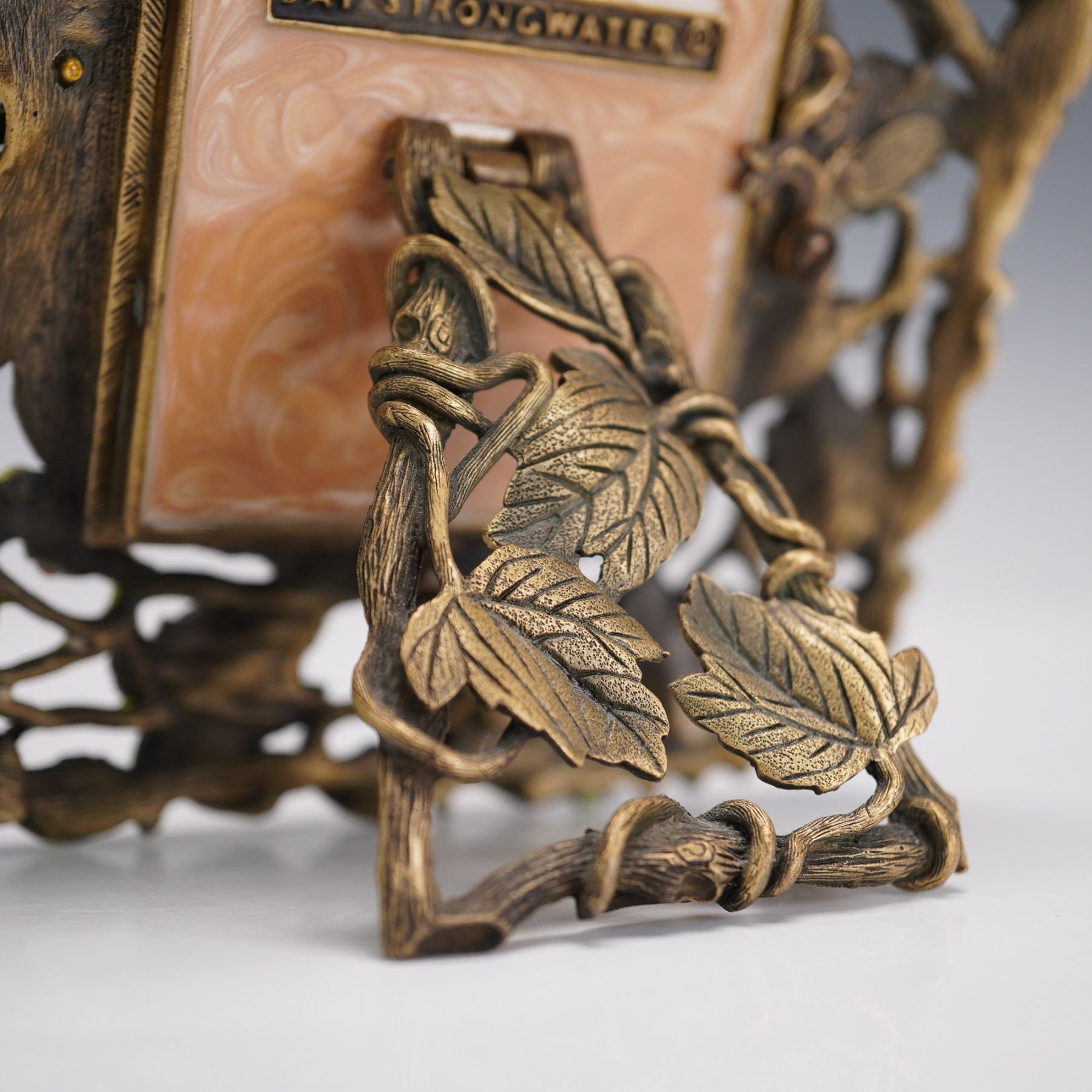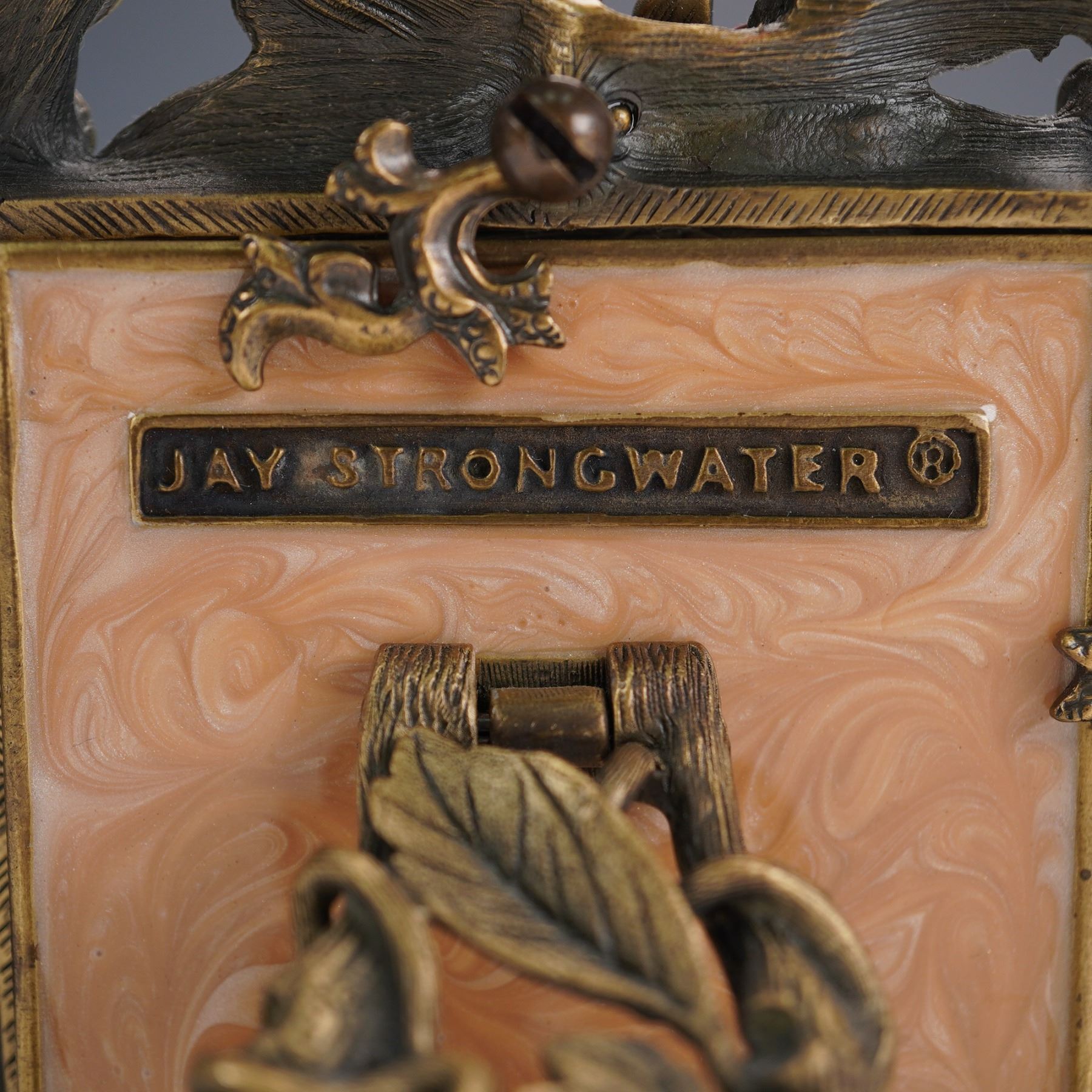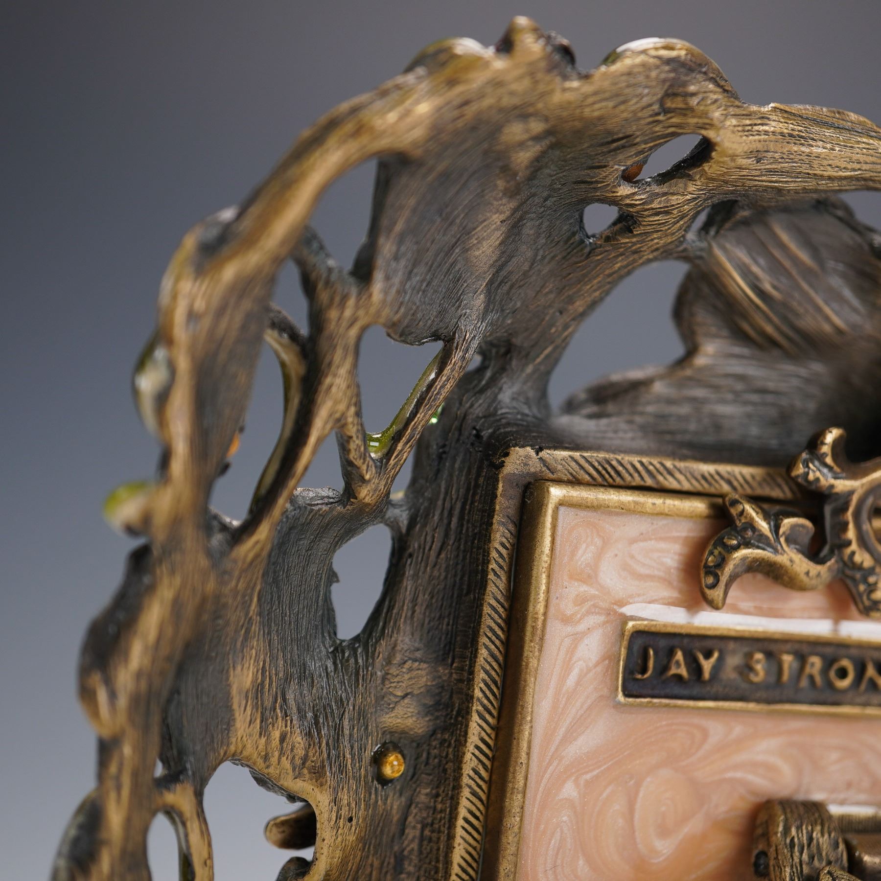Jay Strongwater enamel and jeweled picture frame styled as an garden scene, featuring hand painted vines and autumnal leaves, winding through a sculptural openwork border adorned with sparkling crystal studded frogs, delicate butterflies, and whimsical flies, signed Jay Strongwater, a richly detailed and imaginative design, full of woodland charm and storybook elegance, excellent condition. Marked Jay Strongwater. Marked 5138.