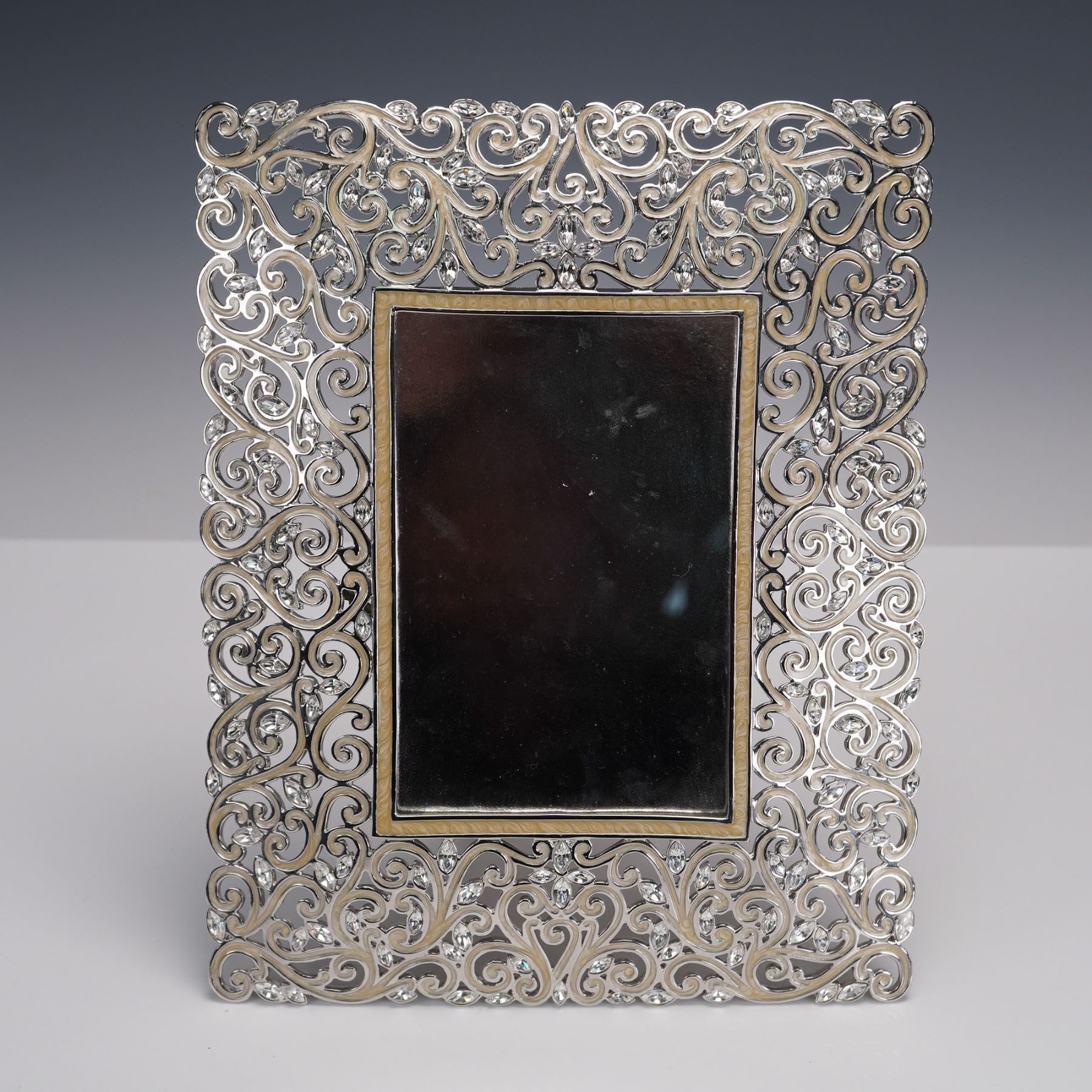 This ornate Jay Strongwater frame features pale enamel accents surrounded by silver scrollwork set with sparkling crystal leaves. The creamy center and polished silver finish create a refined, luminous look, with a matching enameled back and elegant easel support. Marked Jay Strongwater.