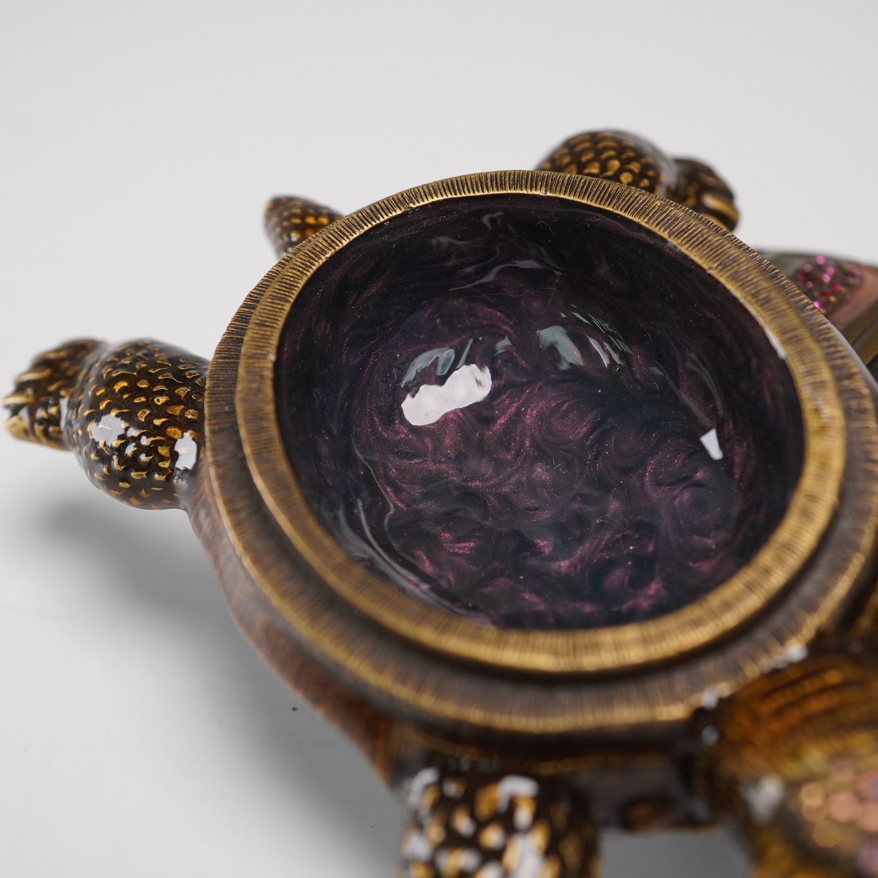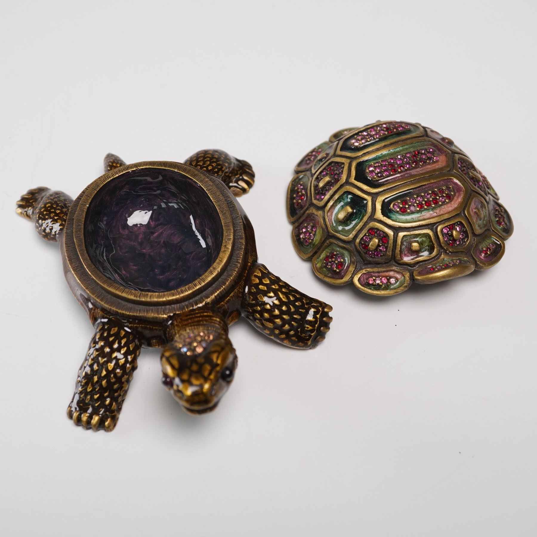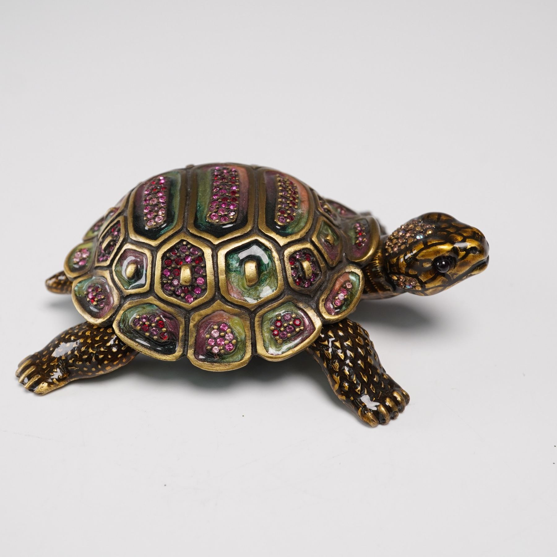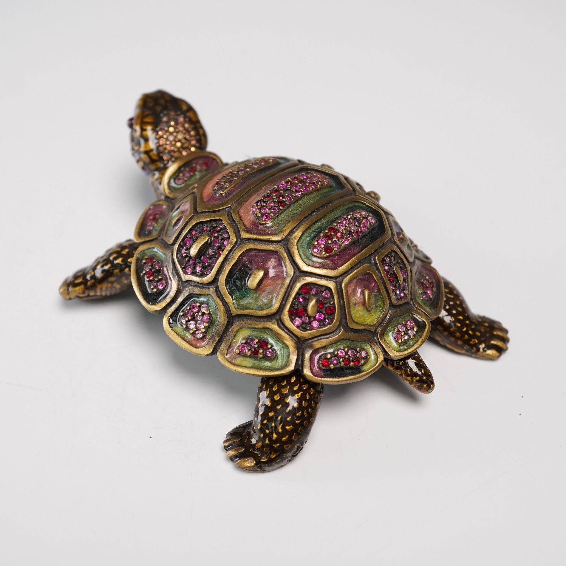 Exquisitely crafted by Jay Strongwater, this figural tortoise treasure box is richly adorned with hand-applied enamel and embellished with vibrant pink crystals set into the intricately sculpted shell. The lifelike form is finished in warm bronze tones with textured limbs and a subtly expressive face, capturing the designer's signature blend of luxury and whimsy. The top shell lifts to reveal a hidden compartment, making this both a stunning decorative accent and a functional box for small treasures. Jay Strongwater mark on the base. Measures 4"L x 1.5"H.