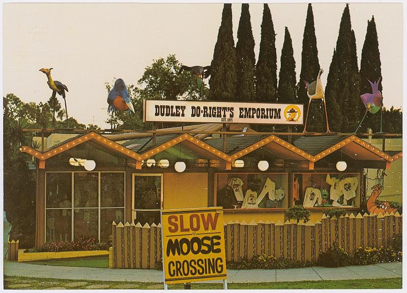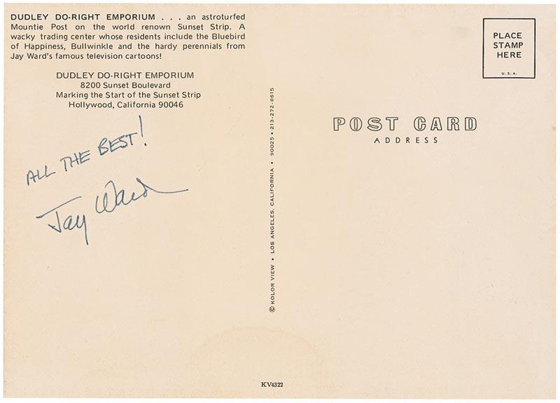 American artist and animator (1920–1989) best known for the smart, sharply satirical tone of such creations as Rocky & Bullwinkle, Dudley Do-Right, and Peabody and Sherman. Color 8 x 5.75 postcard photo of the Dudley Do-Right Emporium, signed on the reverse in blue ink, “All the best! Jay Ward.” In fine condition.