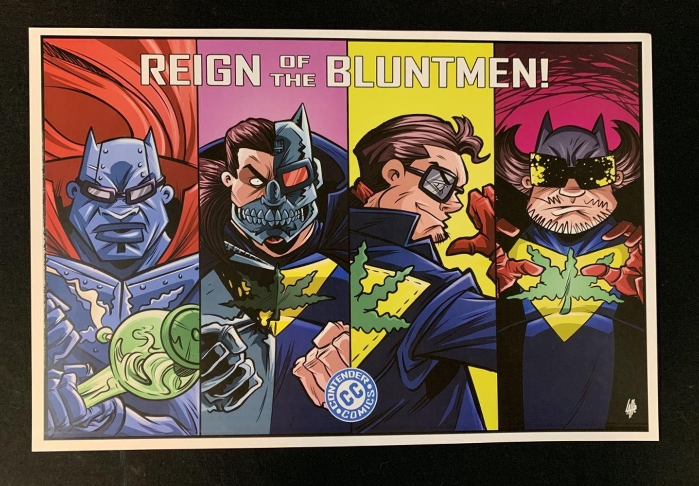 Original prop 'Bluntman - A Blunt In The Family' poster used in the Kevin Smith created comedy film "Jay and Silent Bob Reboot" (2019), where, Jay and Silent Bob return to Hollywood to stop a reboot of 'Bluntman and Chronic' movie from getting made.