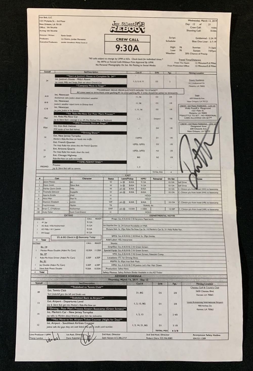 Original call sheet used by Robert Kurtzman who was the special effects makeup department head on the Kevin Smith created comedy film "Jay and Silent Bob Reboot" (2019), where, Jay and Silent Bob return to Hollywood to stop a reboot of 'Bluntman and Chronic' movie from getting made.