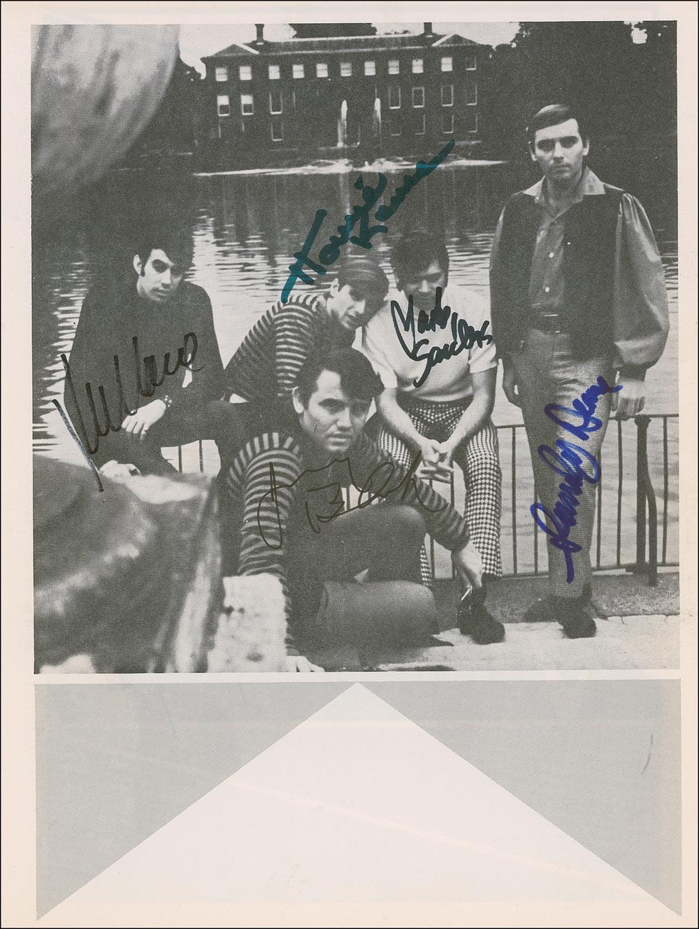 Nice 8.25 x 11 book photo of the band, signed in blue and black felt tip by Jay Black, Kenny Vance, Howie Kane, Sandy Deanne, and Marty Sanders. In fine condition.