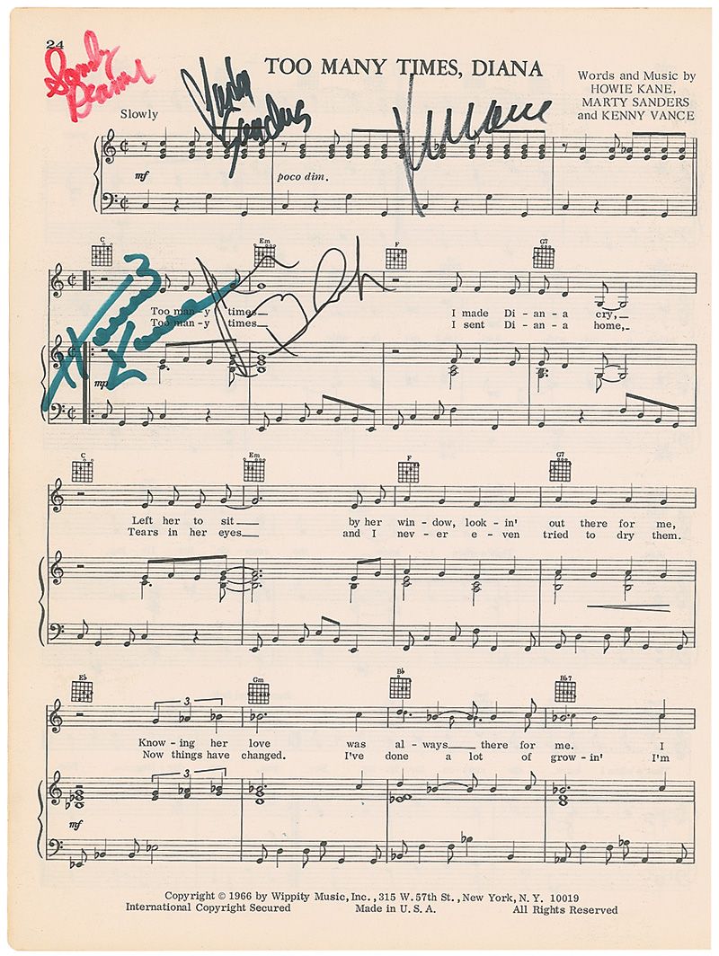 Sheet music to the beginning of ‘Too Many Times, Diana,’ 8 x 11, signed in felt tip by Jay Black, Kenny Vance, Howie Kane, Marty Sanders, and Sandy Deanne. In fine condition, with a uniform shade of mild toning and light creasing to the lower left.