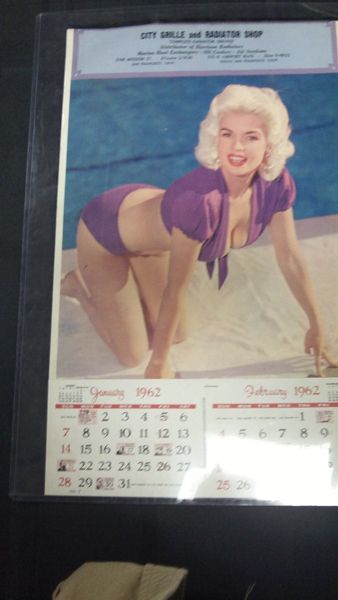 Rare large calendar of Jayne Mansfield on the beach from a 1962 completely intact calendar issued to a City Grille and Radiator Shop in San Francisco, California.  This item comes with a certificate of authenticity guaranteed for the life of the piece.