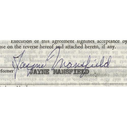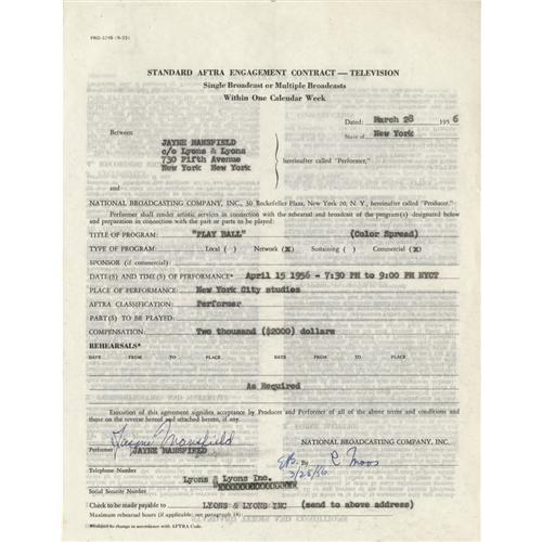 <B>Jayne Mansfield Signed Contract.</B></I> A two-page, double-sided standard AFTRA television contract dated March 28, 1956, engaging Jayne Mansfield to appear on the show <I>Play Ball</B></I> for a sum of $2,000, signed by her in blue ink. In Very Fine to Excellent condition with very mild wear and tanning and staple holes to the top left corner.<I>Accompanied by LOA from PSA/DNA.</B></I><BR><BR><b>Shipping:</b> Small Flat (<a target="_blank" href="http://www.heritageauctions.com/common/shipping.php">view shipping information</a>)