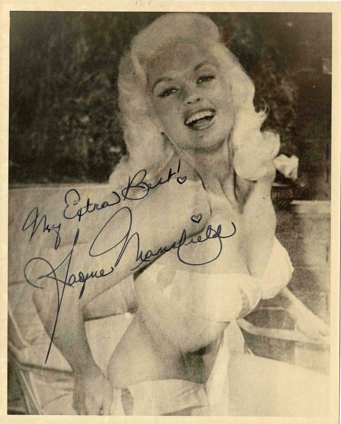 Hollywood darling Jayne Mansfield signed and inscribed photo, ''My Extra Best! / Jayne Mansfield'' with hearts replacing the dots in the exclamation point and her last name. Photo, displaying the actress in a bathing suit in one of her signature smiling poses, measures 8'' x 10'' and is in near fine condition.