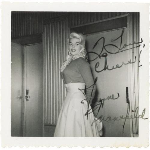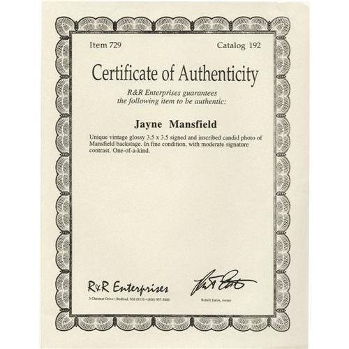 <B>Jayne Mansfield Signed Photo.</B></I> A vintage b&w 3.5" x 3.5" glossy snapshot of Mansfield backstage, inscribed and signed by her in black ink. In Excellent condition with moderate signature contrast.<I>Accompanied by LOA from PSA/DNA.</B></I><BR><BR><b>Shipping:</b> Small Flat (<a target="_blank" href="http://www.heritageauctions.com/common/shipping.php">view shipping information</a>) <BR><BR><B>Important notice: