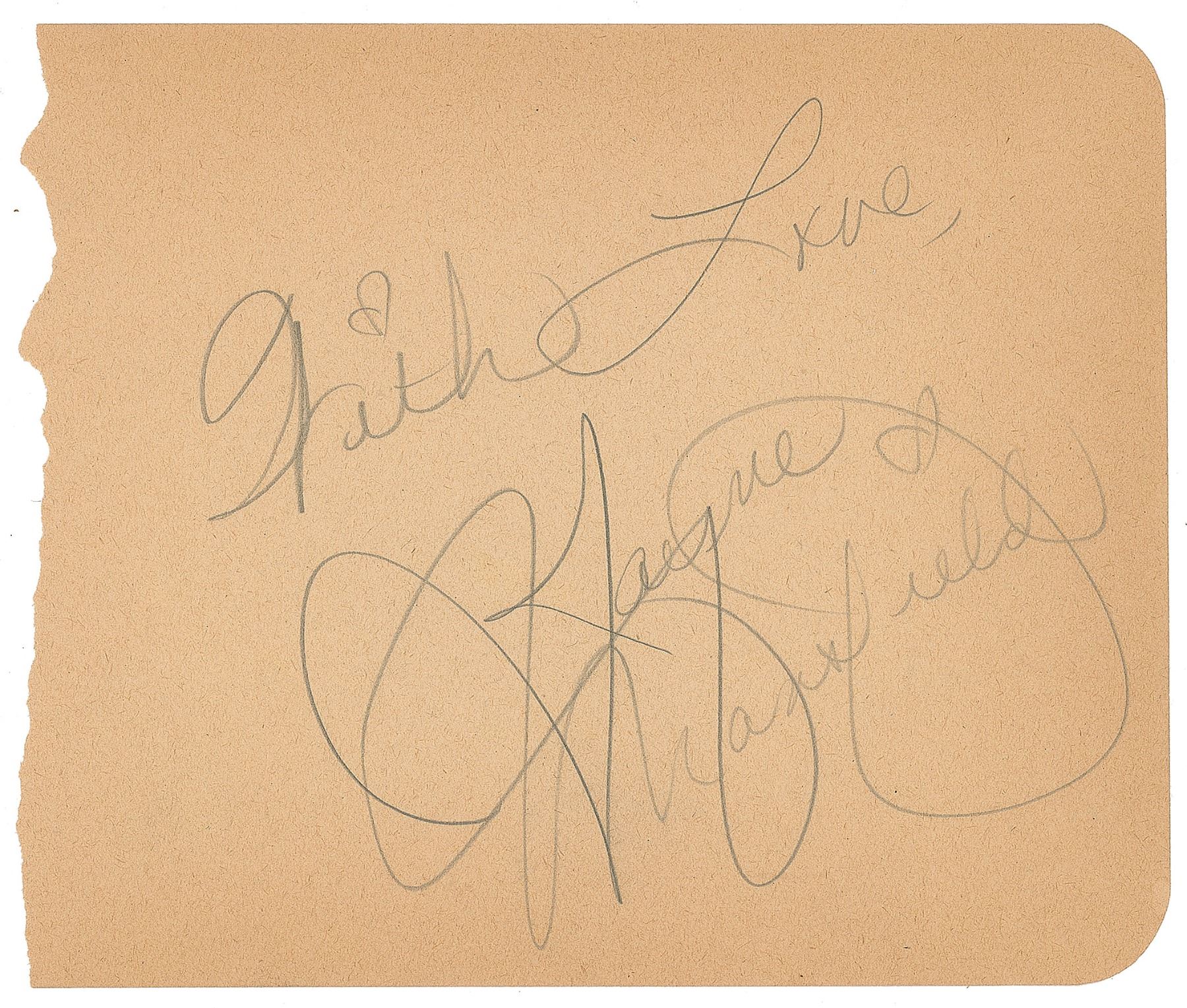 Pencil signature, "With love, Jayne Mansfield,” on an off-white 5.25 x 4.5 album page. In fine condition.