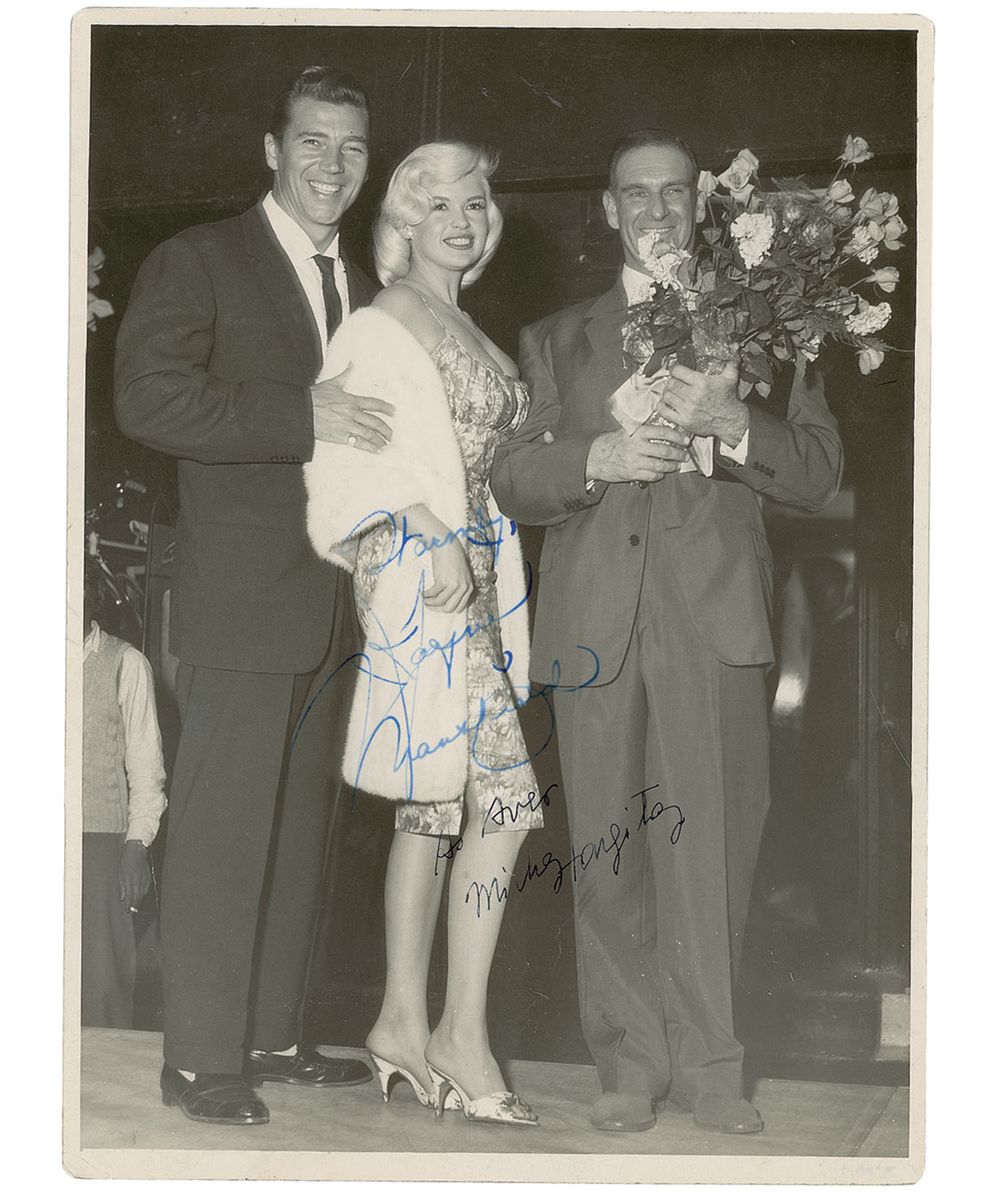 Vintage glossy 7 x 9.25 photo of Mansfield and Hargitay on stage with a gentleman presenting flowers to Jayne, signed in blue ink, “Warmly, Jayne Mansfield,” and signed and inscribed in black ink by Hargitay. In very good condition, with scattered light creases and surface impressions, light overall irregular adhesion to Mansfield’s signature.
