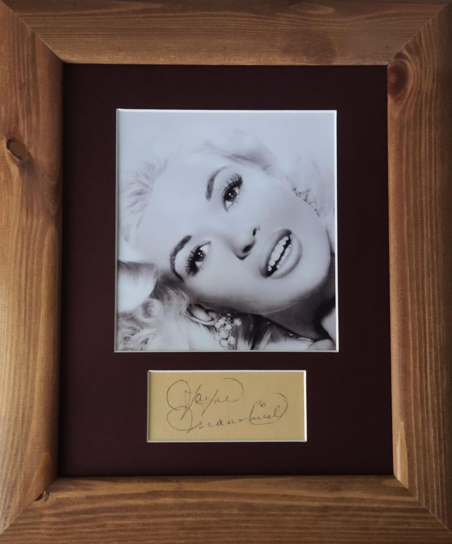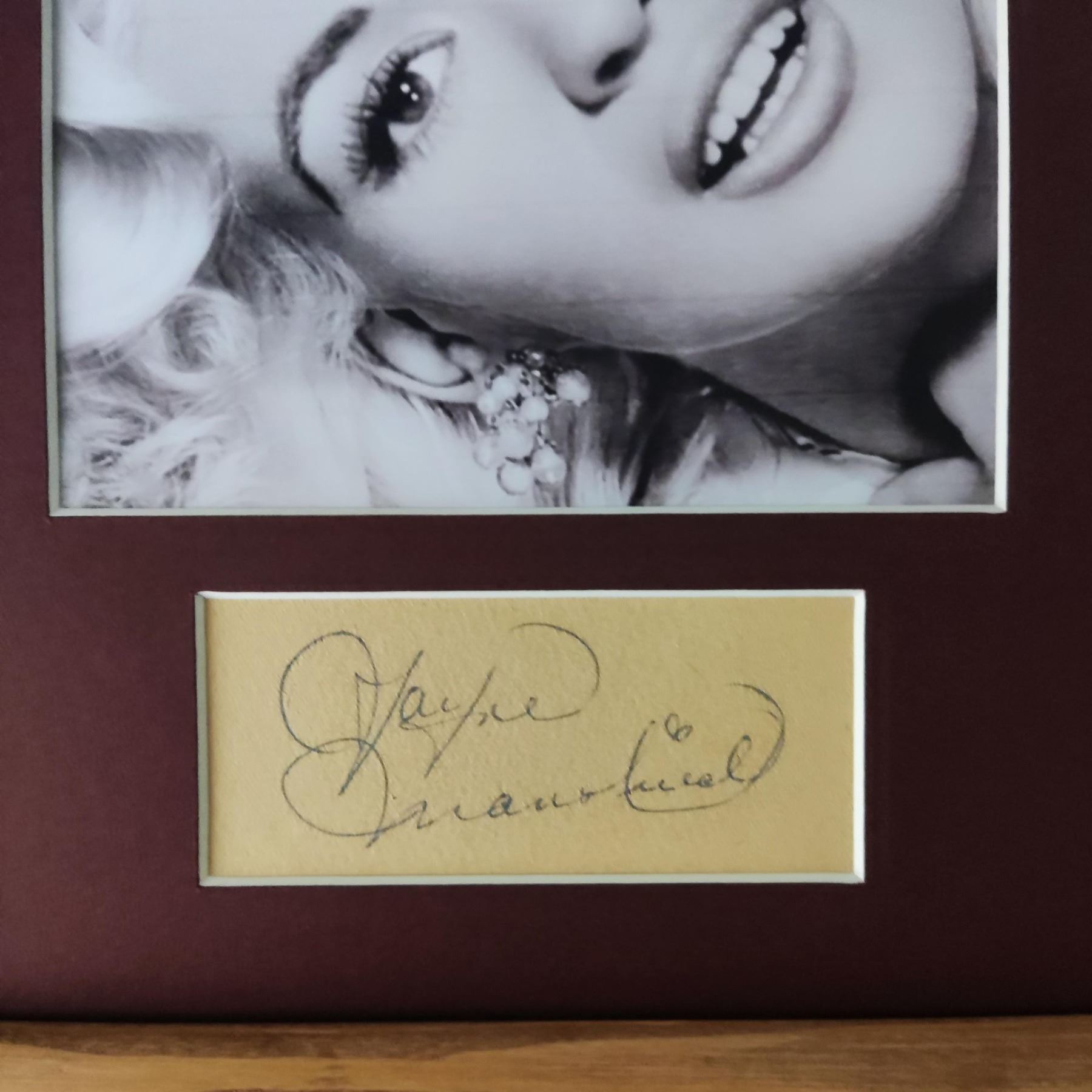 Jayne Mansfield was a sex symbol of the 1950s and early 1960s while under contract at 20th Century Fox, Mansfield was known for her well-publicized personal life and publicity stunts. Her autograph is mounted and framed and supplied with coa.
