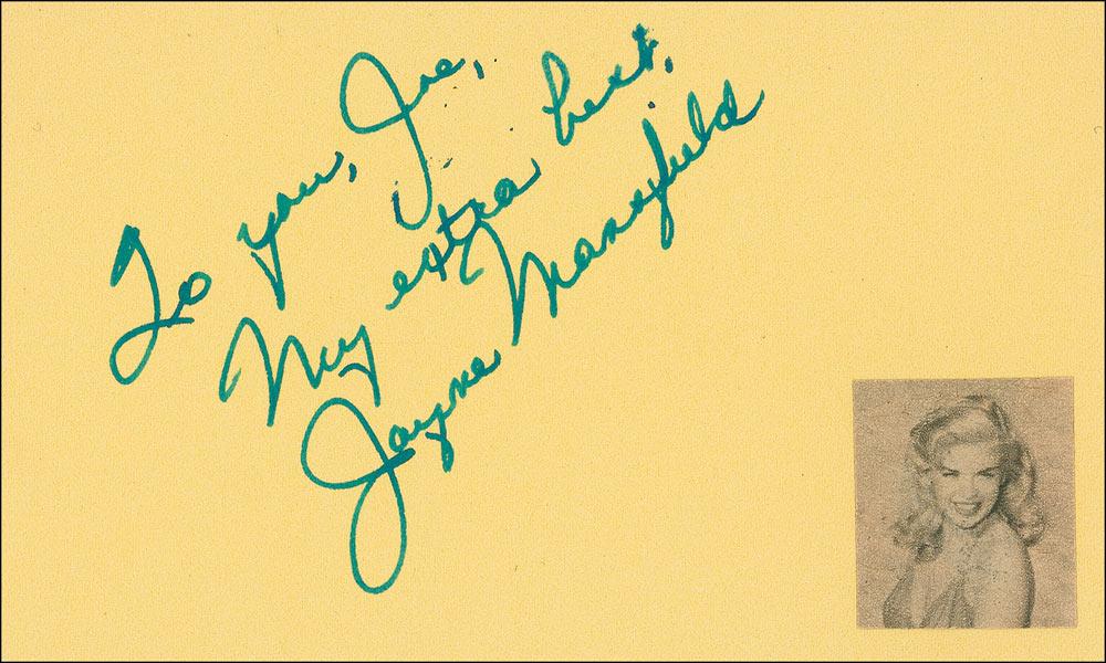 Very early vintage fountain pen in-person signature and inscription, “To you Joe, My extra best, Jayne Mansfield,” on a yellow 5 x 3 card with a small clipped photo affixed to lower right. A few stray ink flecks, otherwise very fine condition.