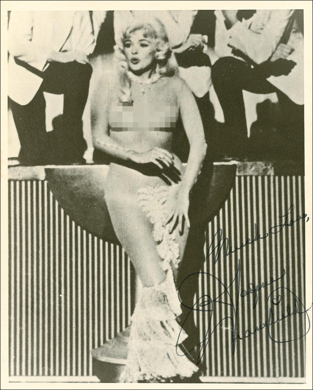 Gorgeous matte-finish 8 x 10 photo of Mansfield in a very revealing outfit, signed in black ink. In fine condition, with brush to the end of her name.