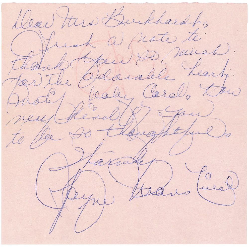 ALS, one page on her folding pink personal letterhead measuring 5.5 x 5.5 when opened, no date, but postmarked February 20, 1964. Mansfield sends thanks to a fan. In full: “Just a note to thank you so much for the adorable heart motif baby card. How very kind of you to be so thoughtful!” In fine condition. Accompanied by the original mailing envelope addressed in Mansfield’s hand. Actress Mariska Hargitay, Mansfield’s daughter with bodybuilder husband Mickey Hargitay, was born on January 23, 1964.