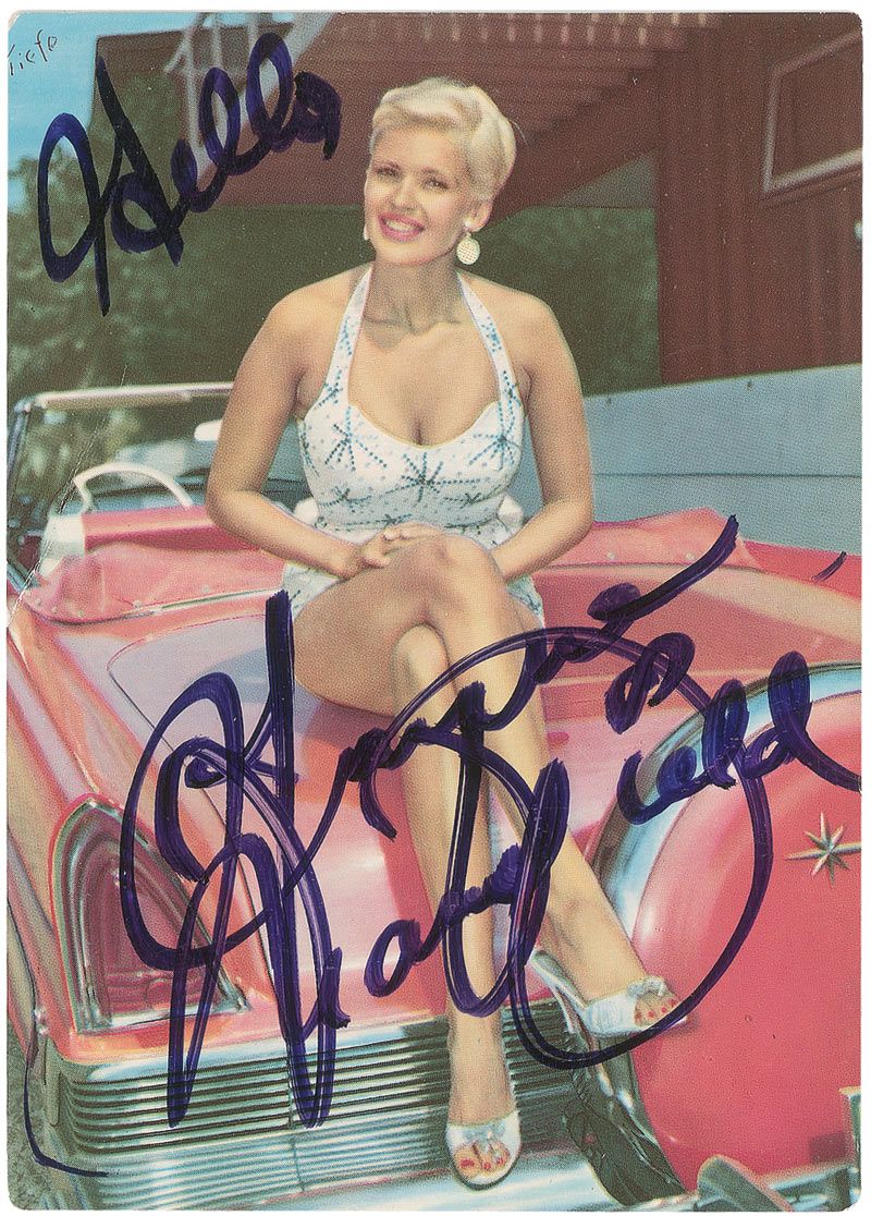 Color vintage 4 x 6 German postcard photo of Mansfield sitting on the trunk of a convertible, signed in black felt tip, “Hello, Jayne Mansfield.” In fine condition, with some scattered light surface marks, not detracting from the overall appearance.