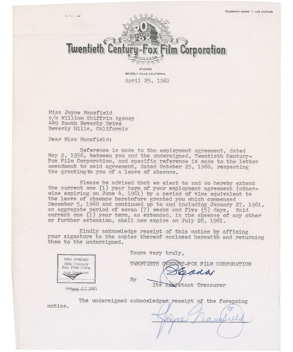 DS, one page, 8.5 x 11, April 25, 1961. Agreement between Mansfield and 20th Century Fox granting Mansfield a leave of absence from her contract, and extending her contract by the length of that leave. Signed at the bottom by Mansfield and also signed by the studio’s assistant treasurer. In fine condition, with expected folds, staple holes along top edge and a few edge dings.