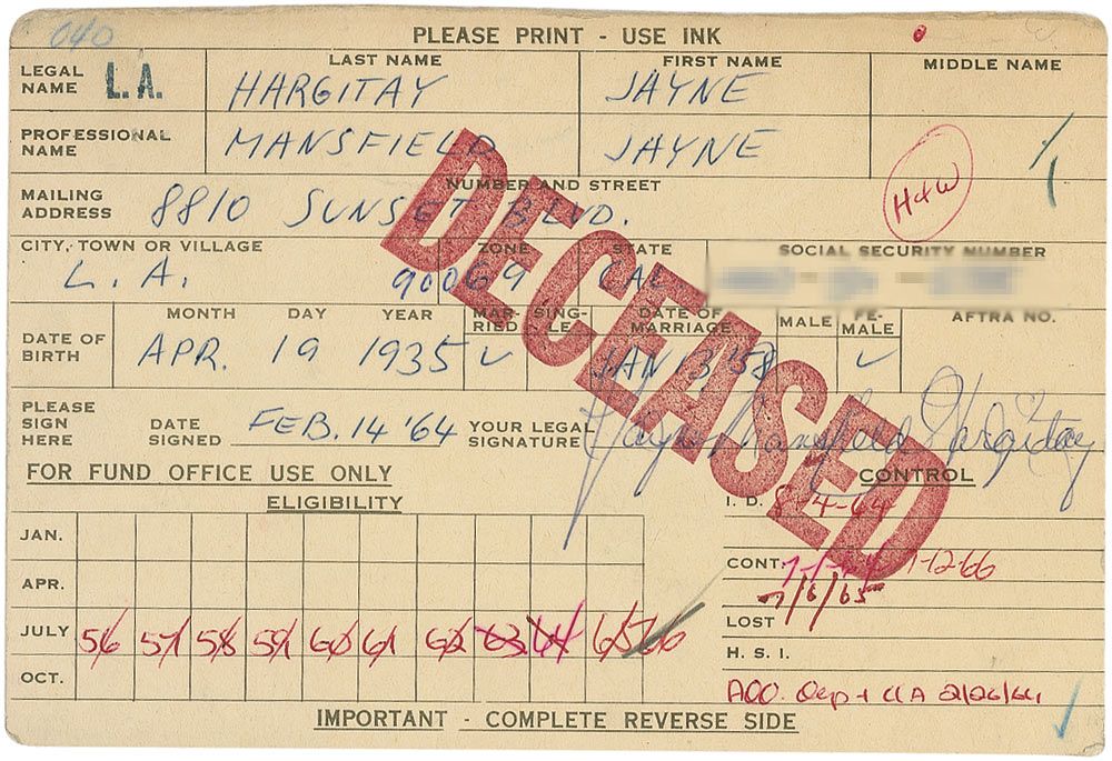 Mansfield’s rare yellow AFTRA union P&W benefits card, one page, both sides, 6 x 4, dated February 14, 1964. Pension and Welfare benefit card is filled out in another hand listing her legal and stage names, Los Angeles address, birthdate, and Social Security number. Signed at the bottom in blue ballpoint with her full married name “Jayne Mansfield Hargitay” On the reverse, her husband Mickey Hargitay is listed as the recipient of her death benefits, followed by four of her five children including now famous actress daughter Mariska Hargitay. Stamped across the front of the card is “Deceased.” Several office notations, most of her signature obscured by the “Deceased” stamp, and wear particularly to the top edge, otherwise fine condition. A rare piece of Mansfield’s life—she would die only three years later.
