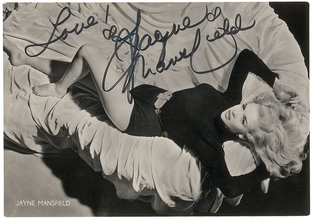 Vintage glossy 6 x 4 German postcard photo of Mansfield reclining, signed in black felt tip, “Love, Jayne Mansfield.” In fine condition, with a few surface dings and Mansfield signing over a partial first attempt done in ballpoint.
