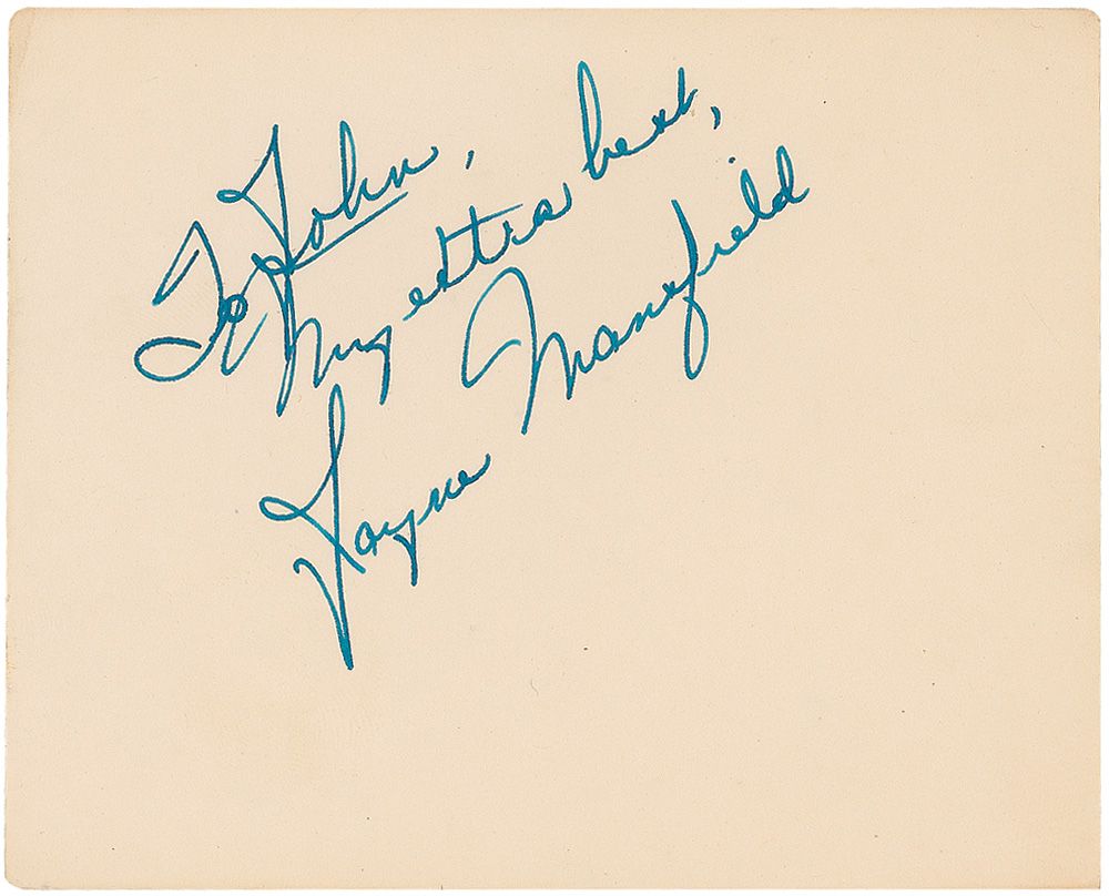 Vintage fountain pen signature and inscription, “To John, My extra best, Jayne Mansfield,” on an off-white 5.5 x 4.5 album page. In fine condition.