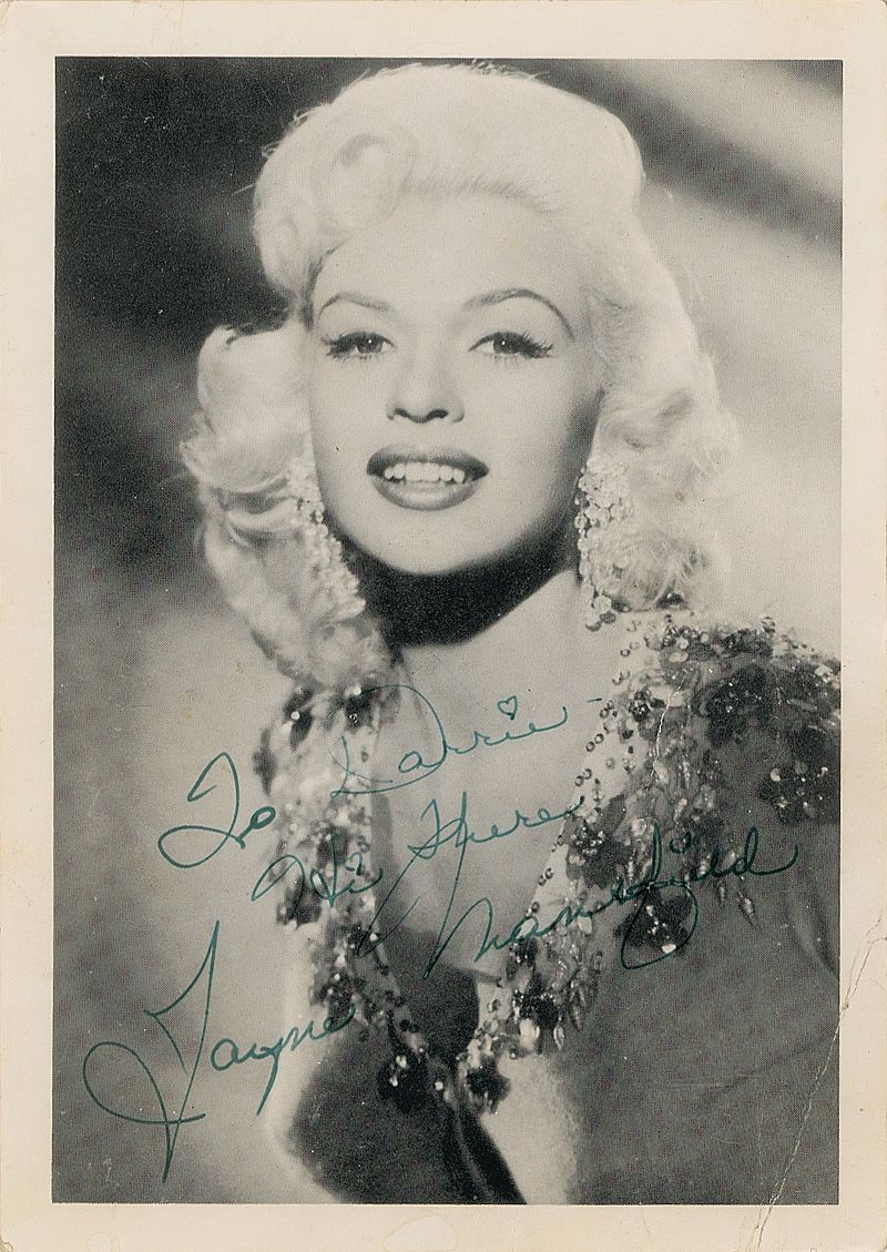Vintage 5 x 7 cardstock photo, signed and inscribed in fountain pen, “To Darrie, Hi there, Jayne Mansfield.” In very good condition, with a few scattered creases and surface marks and moderate contrast to last name.