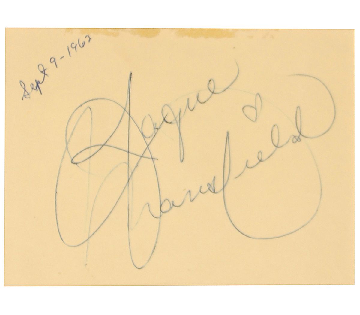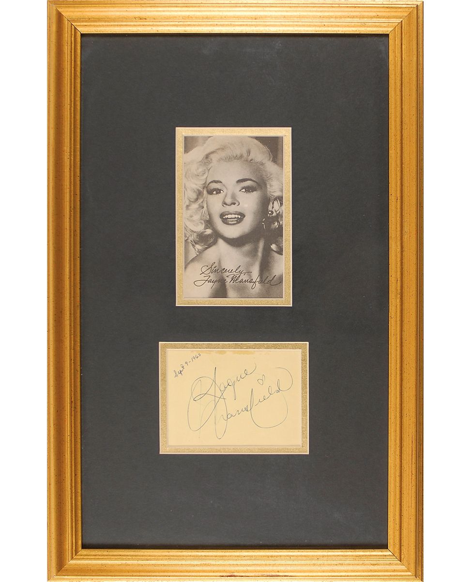 Vintage ballpoint signature, “Jayne Mansfield,” on an off-white 4 x 3 album page, with “Sept 9, 1962” added above the signature in a different hand. Double matted and framed with a photo of Mansfield to an overall size of 11.5 x 18. In fine condition, with a few creases and some toning at the very top of the album page.