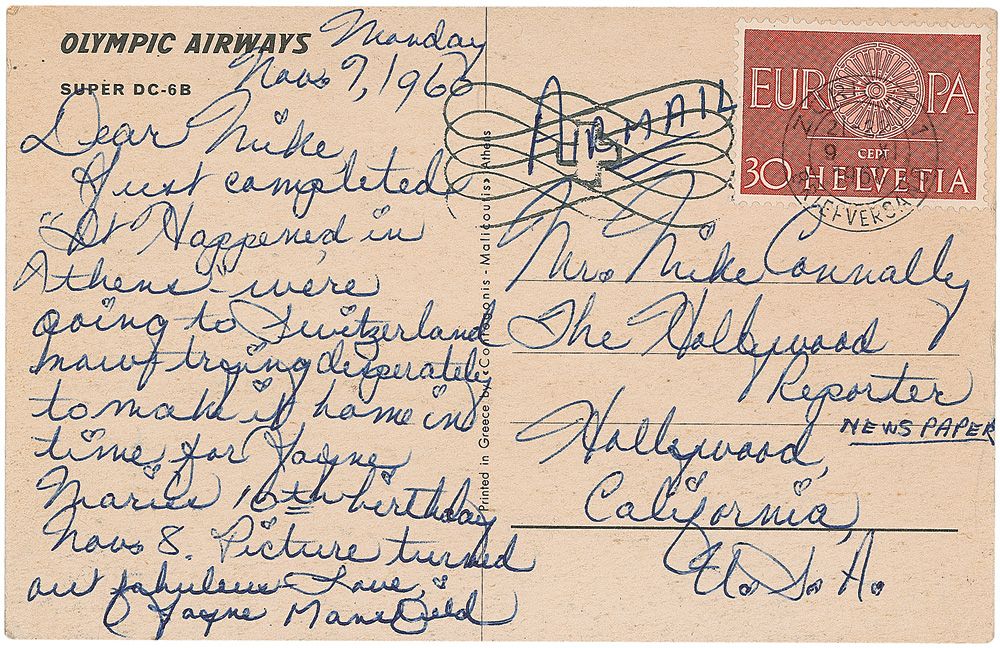 ALS, one page on an Olympic Airways postcard, 5.5 x 3.5, November 9, 1960. A letter to Hollywood Reporter journalist Mike Connally. In full: “Just completed ‘It Happened in Athens’—we’re going to Switzerland now—trying desperately to make it home in time for Jayne Marie’s 10th birthday Nov 8. Picture turned out fabulous.” Mansfield has also addressed the postcard. In fine condition, with paperclip impressions to the front of the postcard and mild corner tip creasing.