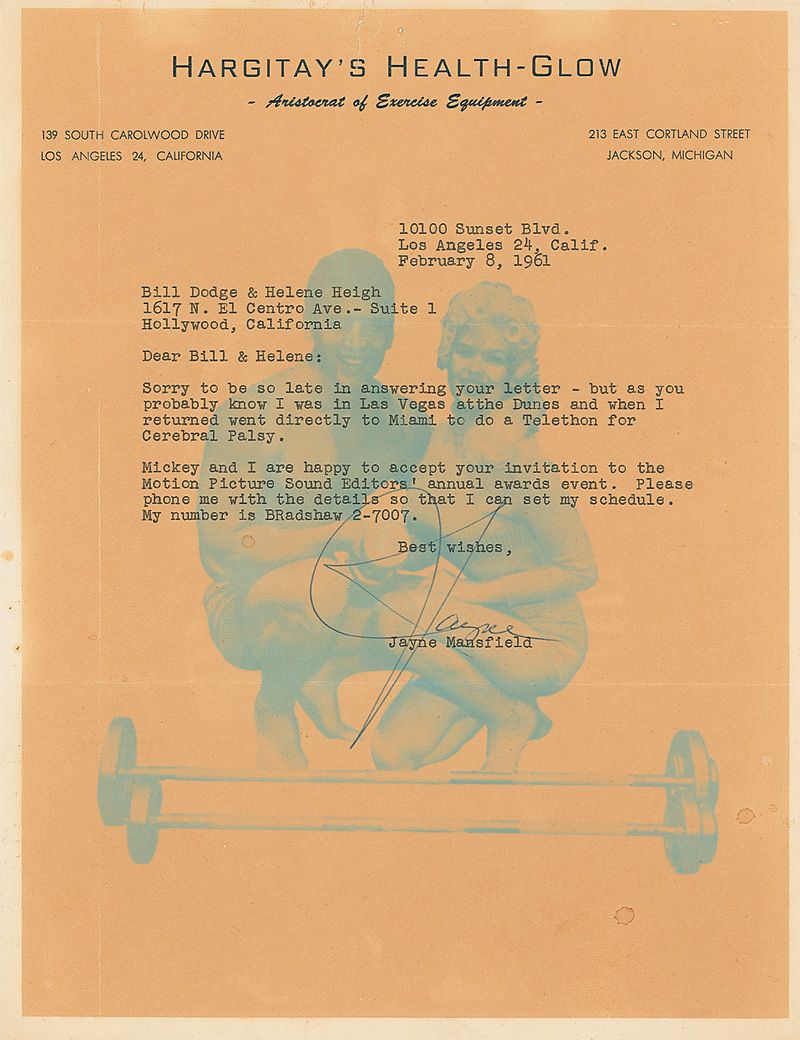 TLS signed “Jayne,” one page, 8.5 x 11, pictorial Hargitay’s Health-Glow letterhead, February 8, 1961. Mansfield accepts an invitation. In part: “As you probably know I was in Las Vegas at the Dunes and when I returned went directly to Miami to do a Telethon for Cerebral Palsy. Mickey and I are happy to accept your invitation to the Motion Picture Sound Editors’ annual awards event.” In very good condition, with usual folds, toning from previous framing, a few small spots, and pinholes and small tears to top edge. Accompanied by two unsigned photos.