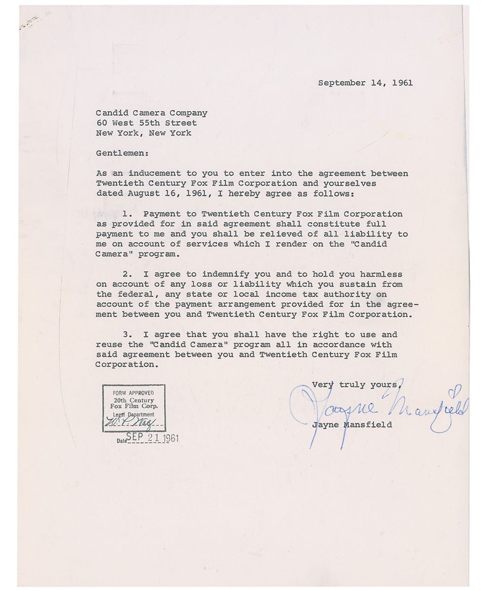 TLS, one page, 8.5 x 11, September 14, 1961. Letter to the Candid Camera Company regarding payment and reuse of her appearance on the show. Letter concludes: “I agree that you shall have the right to use and reuse the ‘Candid Camera’ program all in accordance with said agreement between you and Twentieth Century Fox Film Corporation.” Signed at the conclusion in blue ballpoint by Mansfield. In fine condition, with office stamp to lower left, and staple holes to top corner.