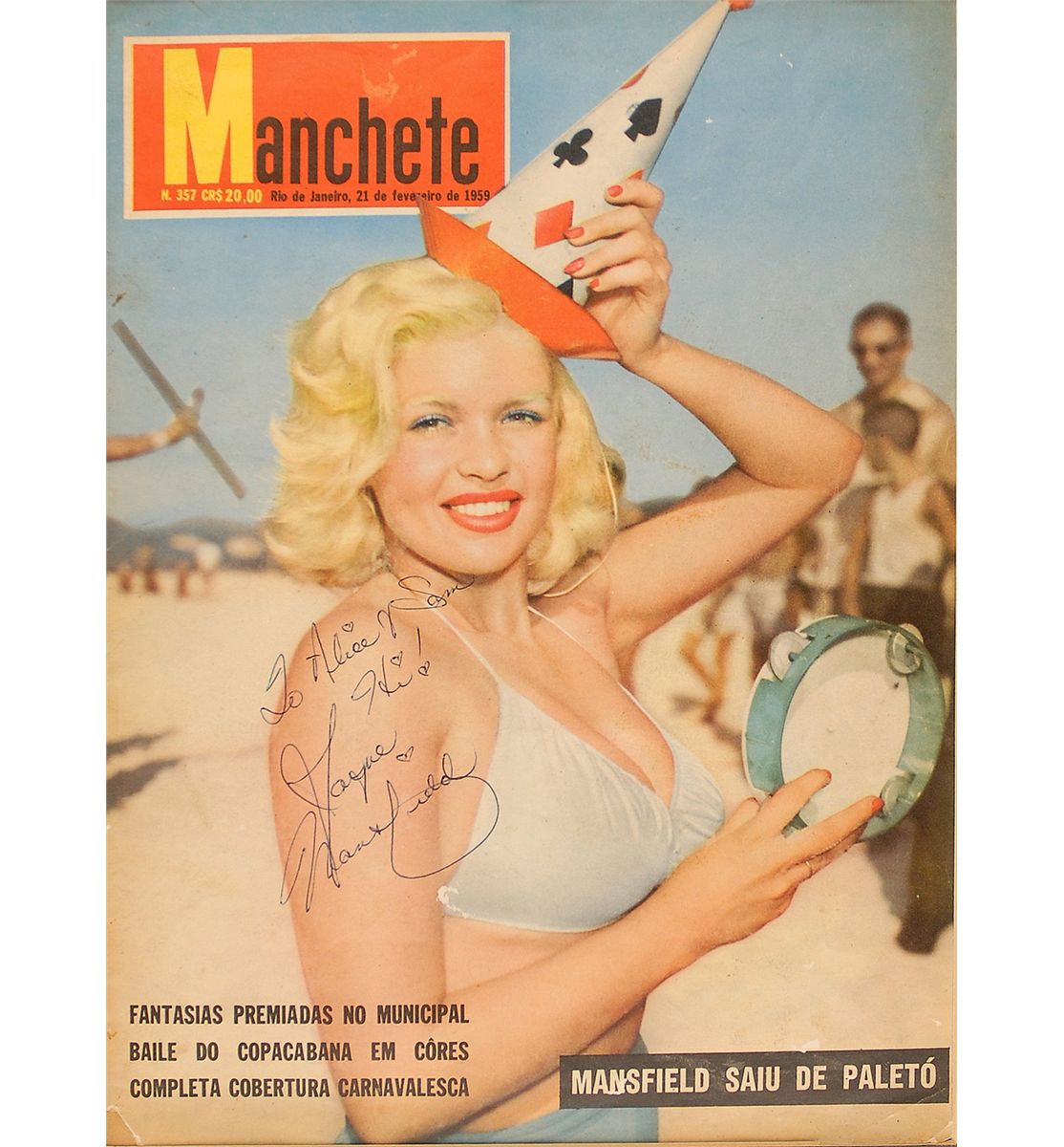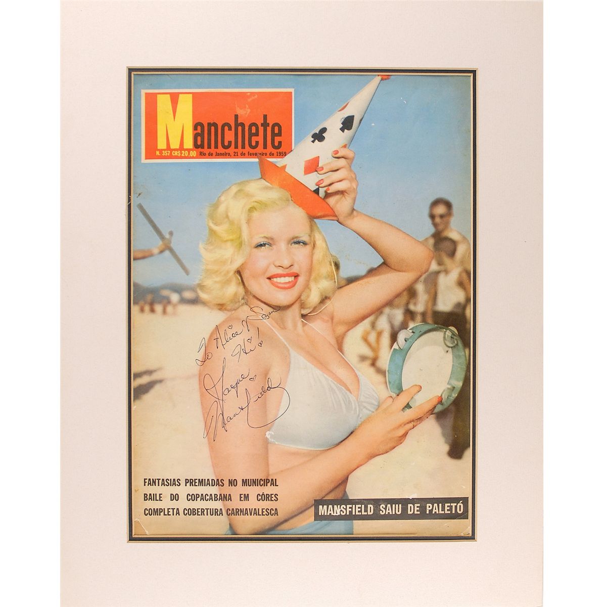 Brazilian Manchete magazine, 9.75 x 13.5, February 21, 1959, featuring Mansfield on the cover, signed and inscribed on the cover in blue ballpoint, “To Alice & Sam, Hi! Jayne Mansfield.” Double matted to an overall size of 14 x 17.75, but it appears as though the complete magazine is present. Scattered creases and soiling, and a couple spots of light surface loss, otherwise fine condition.