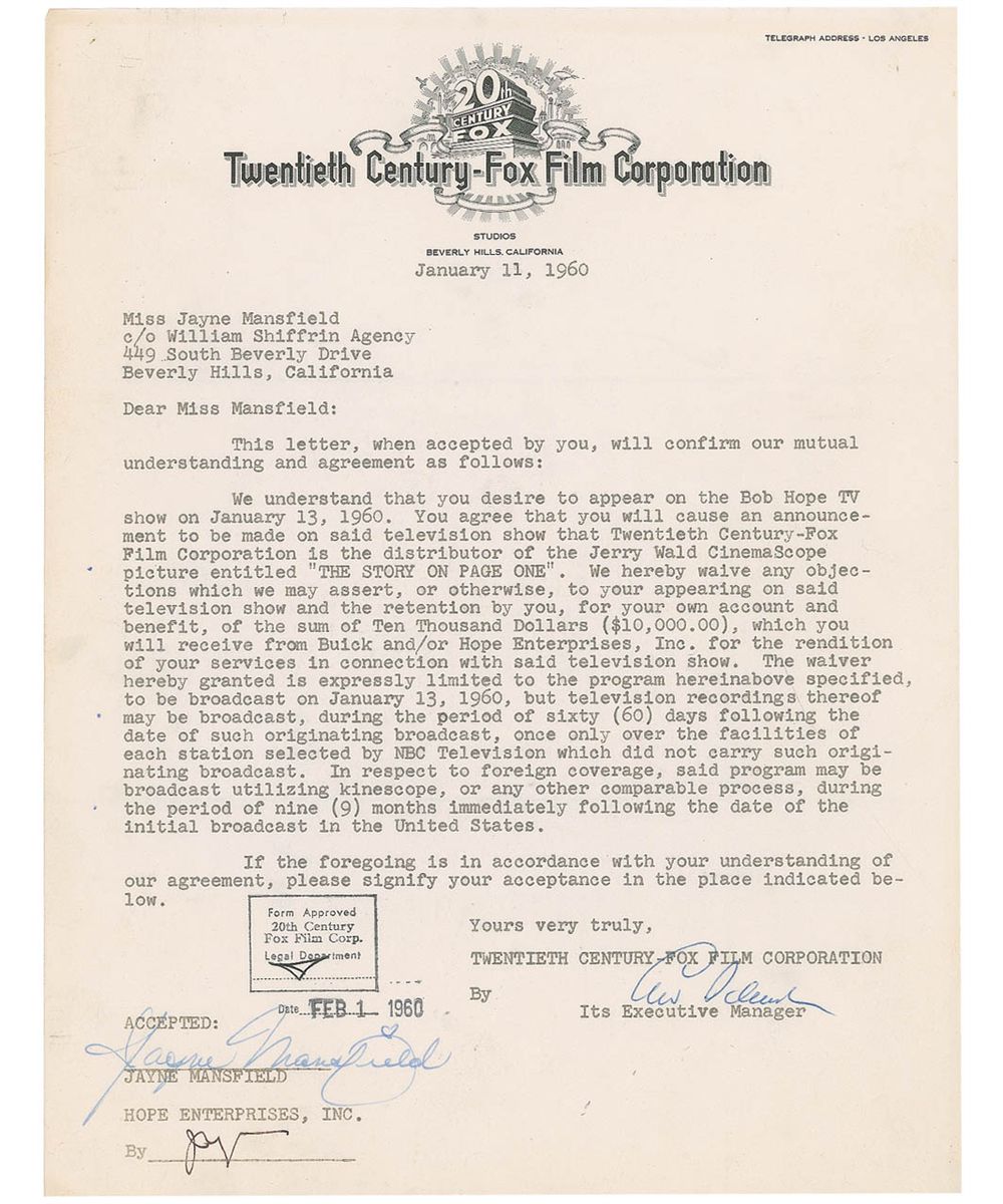 DS, one page, 8.5 x 11, January 11, 1960. Agreement between Mansfield and 20th Century Fox Film Corporation for Mansfield to appear on the Bob Hope television show for an announcement about an upcoming Jerry Wald film entitled The Story on Page One, in return for a payment of $10,000. In fine condition, with two horizontal storage folds and a mild crease to the lower right.