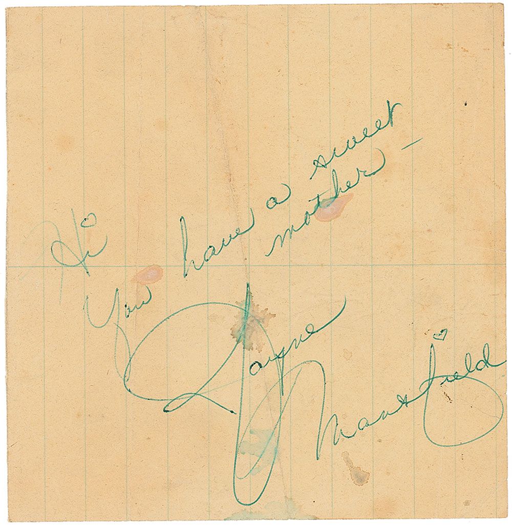 Ballpoint signature, “Hi, You have a sweet mother—Jayne Mansfield,” on an off-white 6 x 6 lightly-lined sheet. In very good condition, with several creases, a few spots and stains over small portions of signature and sentiment, as well as some light toning.