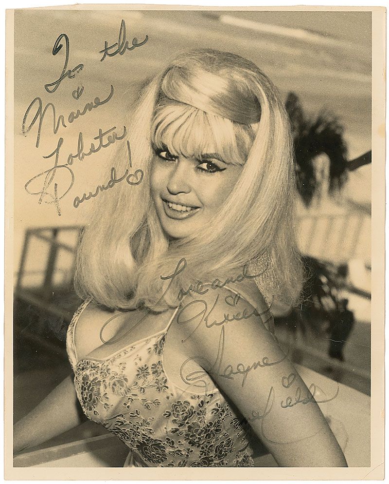 Alluring vintage glossy 8 x 9.75 photo, signed and inscribed in black felt tip “To the Maine Lobster Pound! Love & Kisses, Jayne Mansfield.” In very good condition, with slightly trimmed top edge, scattered creases and ripples, and signature and inscription a shade or two light, but still legible.