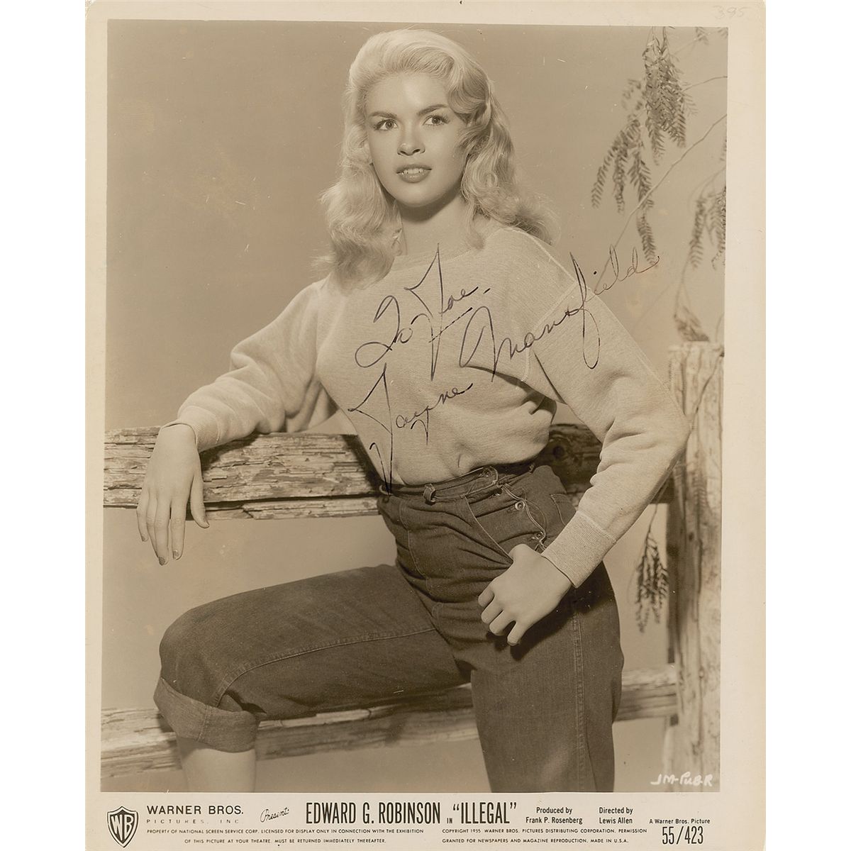 Glossy 8 x 10 Warner Bros. promotional photo for Illegal, signed and inscribed in fountain pen, “To Joe, Jayne Mansfield.” Scattered creases, mainly to edges and corners, and last few letters of signature a few shades light due to decreased ink flow, otherwise fine condition.