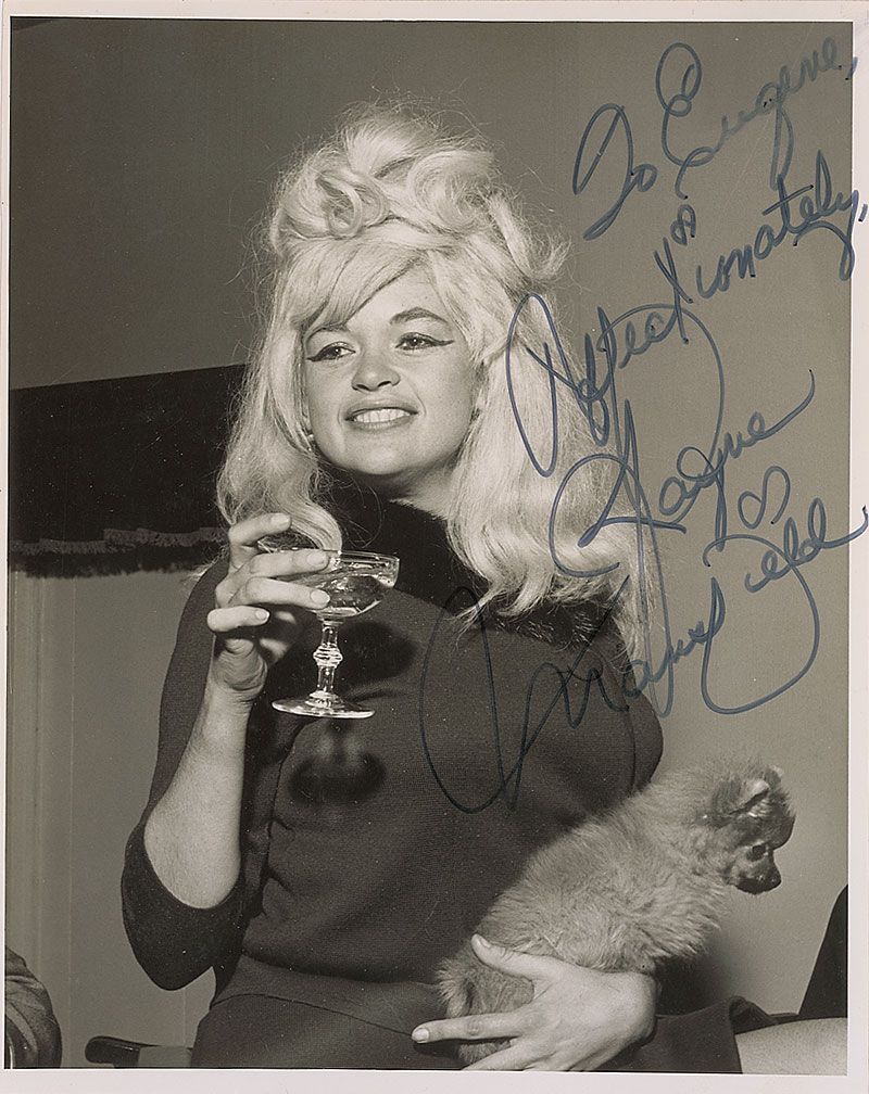 Vintage glossy 8 x 10 photo of Mansfield holding a cocktail in one hand and a small dog in the other, signed and inscribed in black felt tip, “To Eugene, Affectionately, Jayne Mansfield.” Some scattered light bends and creases, otherwise fine condition.